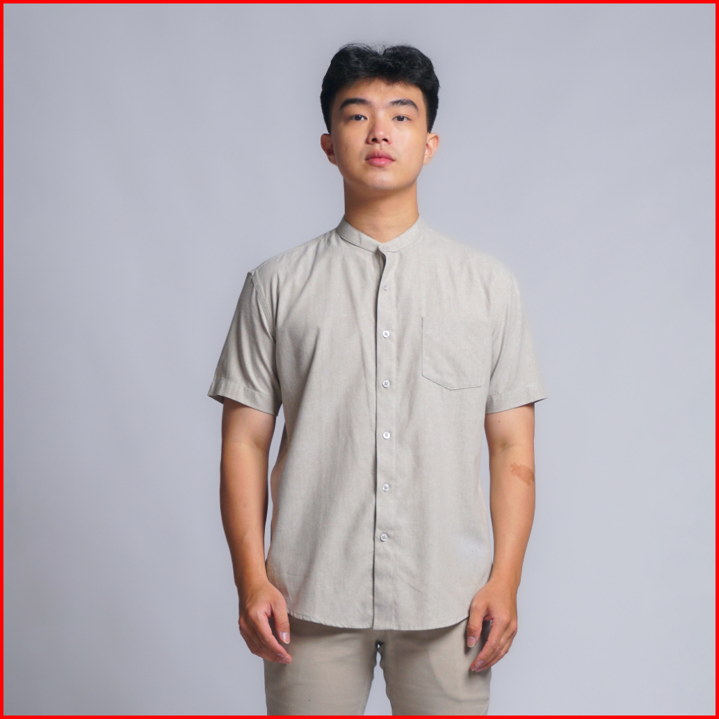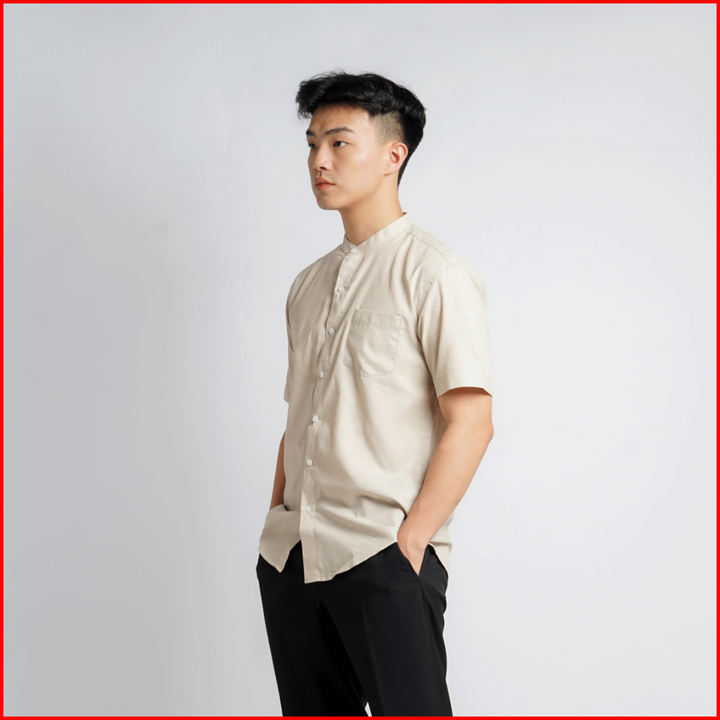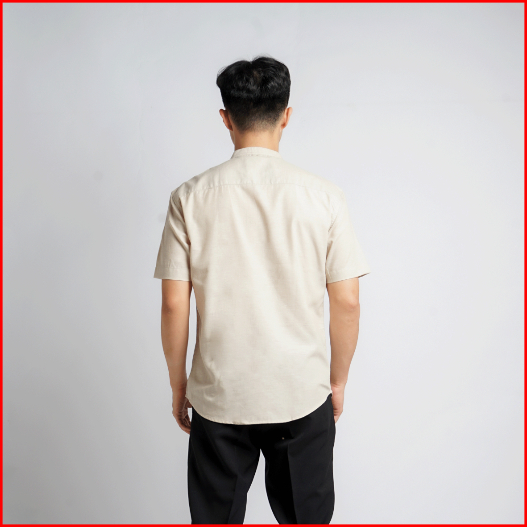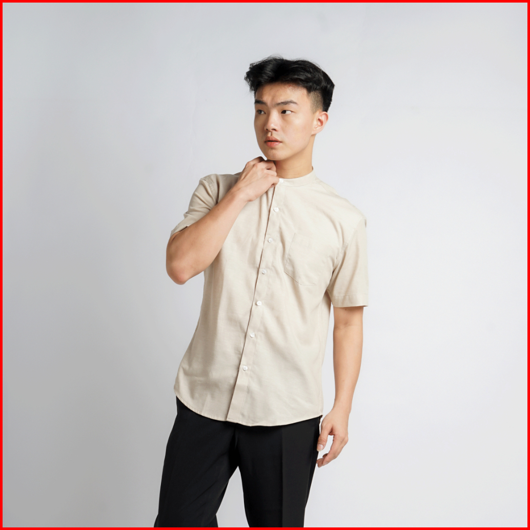Kemeja Oxford Kerah Mandarin Lengan Pendek Cream