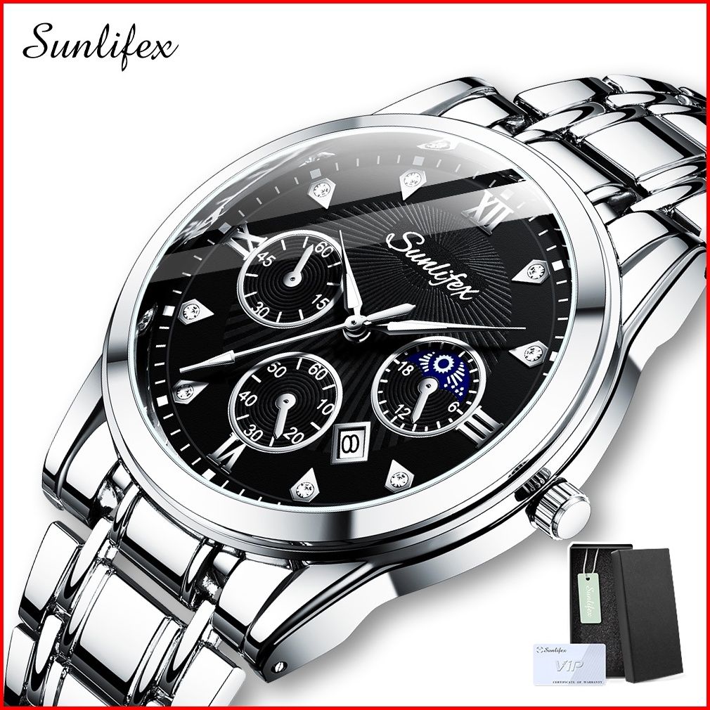 Sunlifex Jam Tangan Pria Original 9004a Kuarsa Calendar Tali Stainless Steel Mode Santai Jam Tangan Cowok