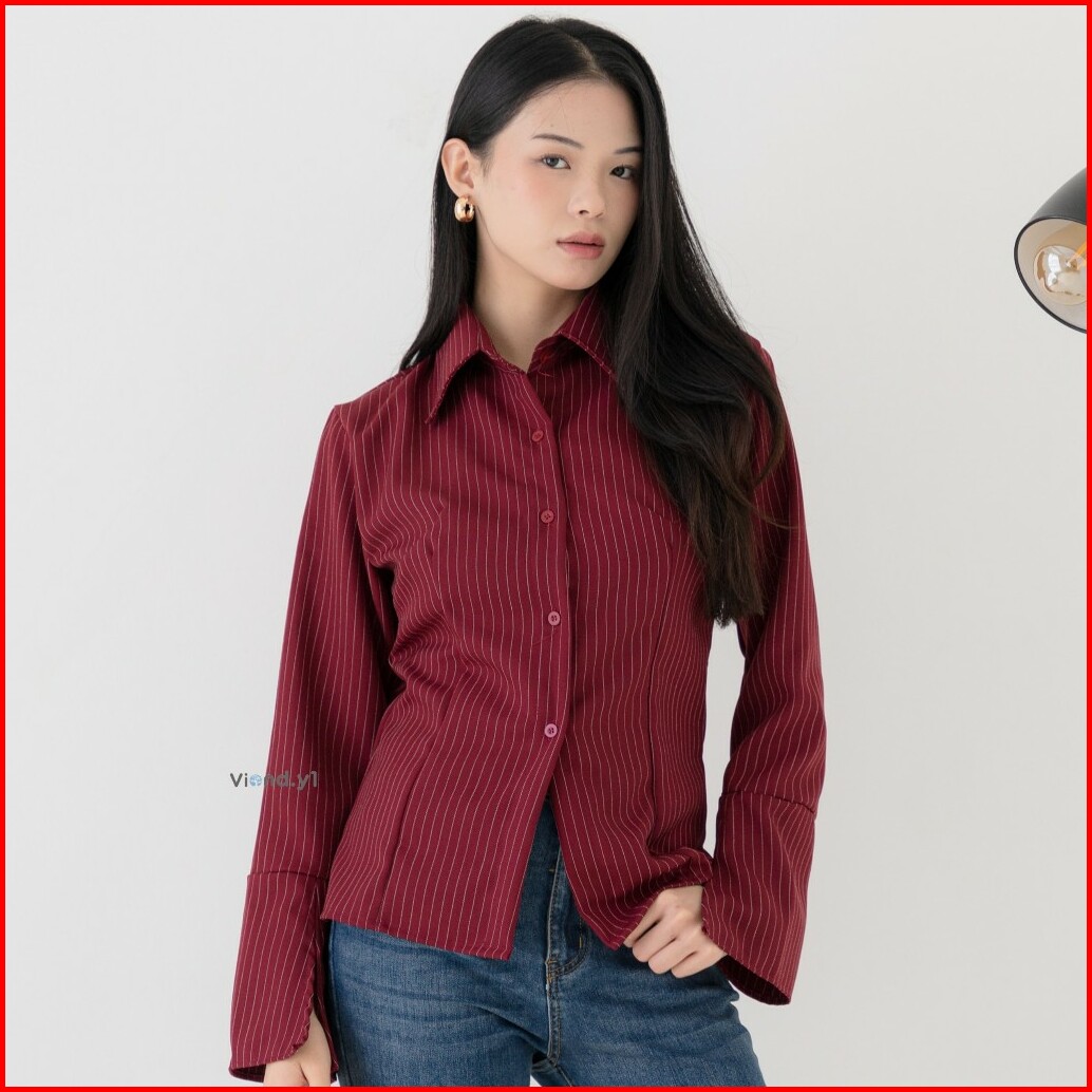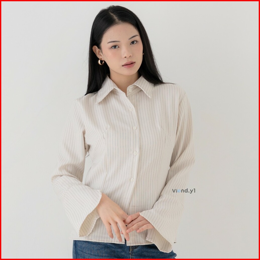Blouse Fitted Salur Kemeja Wanita Longsleeve Atasan Stripe Cewek Korea Slim Fit E.213