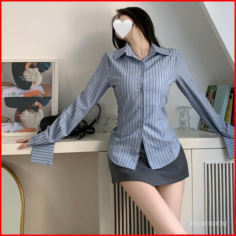 Nico Kemeja Lengan Panjang Bergaris Biru Wanita Atasan Baju Kemeja Wanita Korean Style