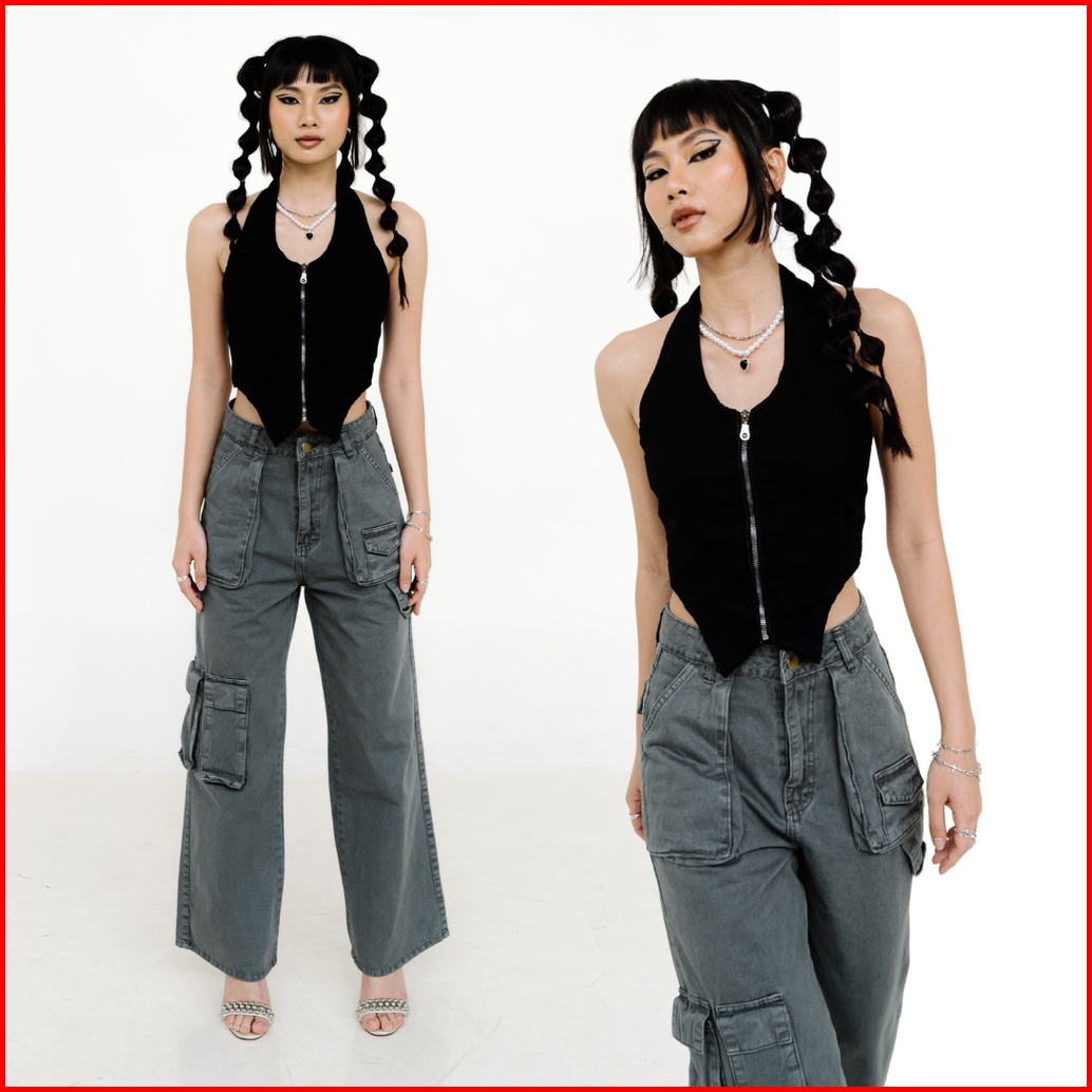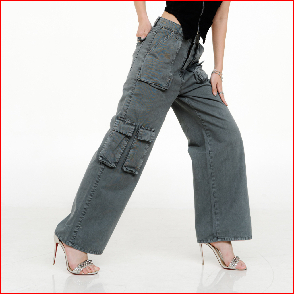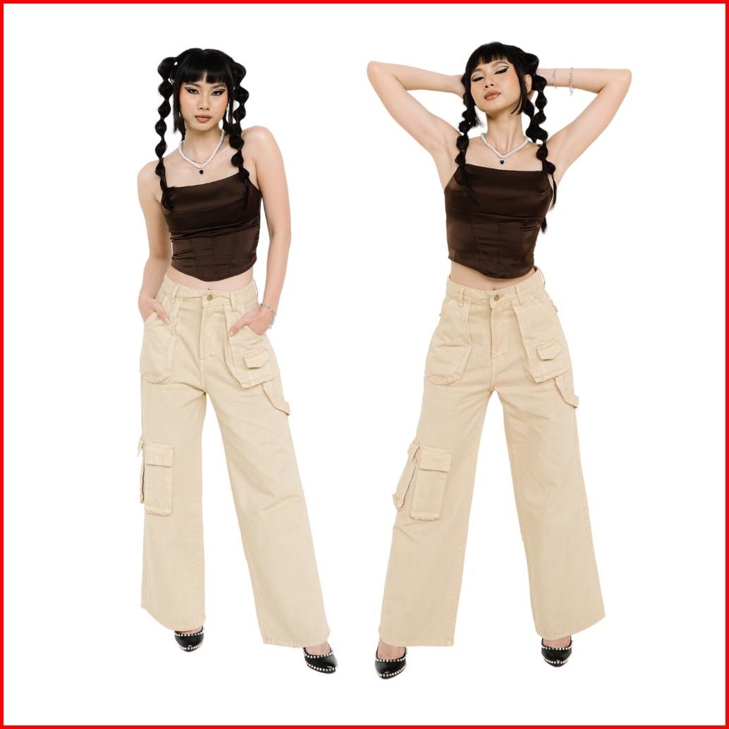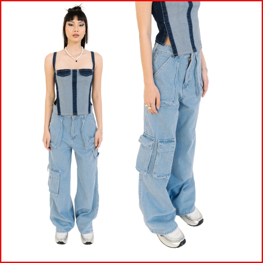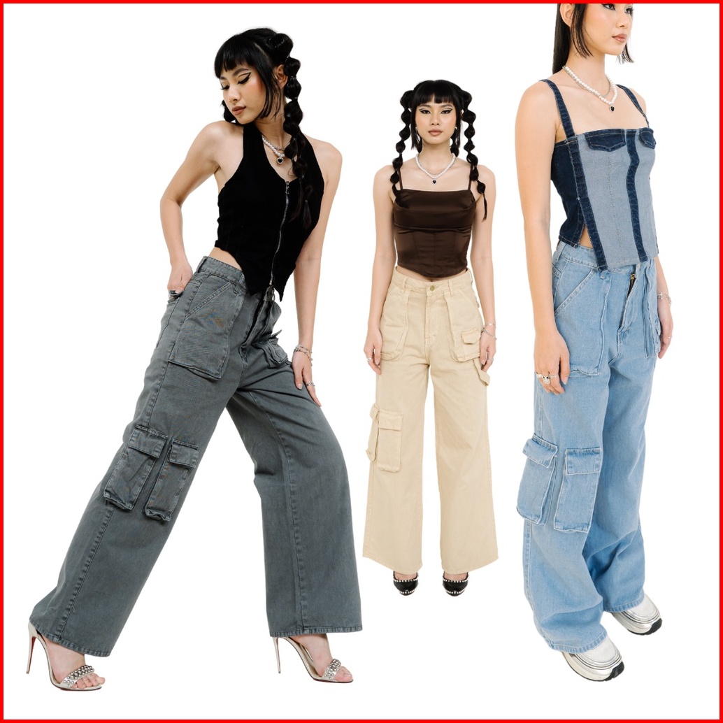 Ladouce - Yeji High Waist Cargo Jeans Grey Beige Blue Celana Panjang Wanita