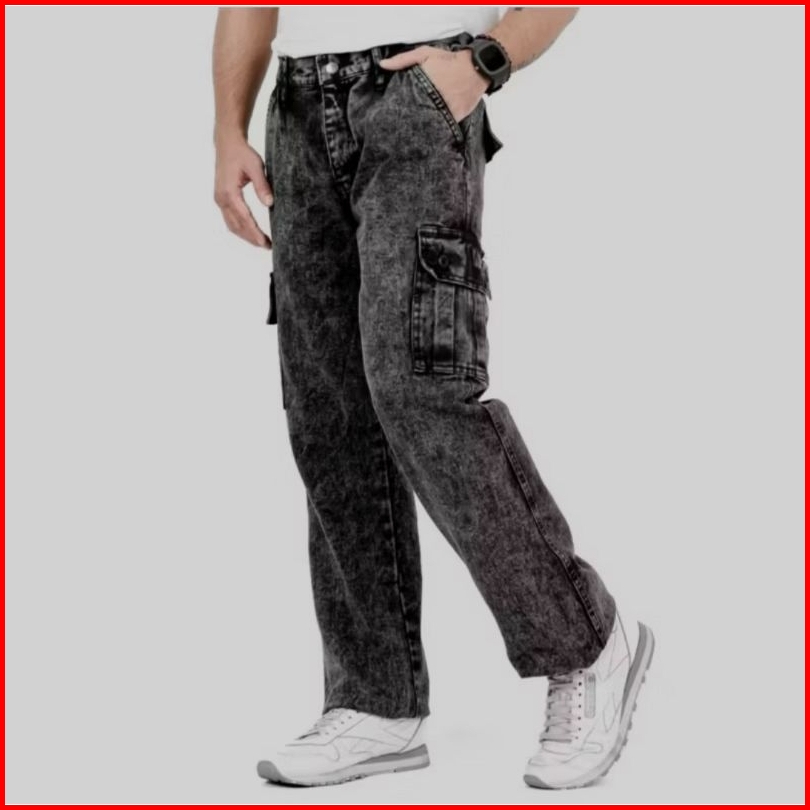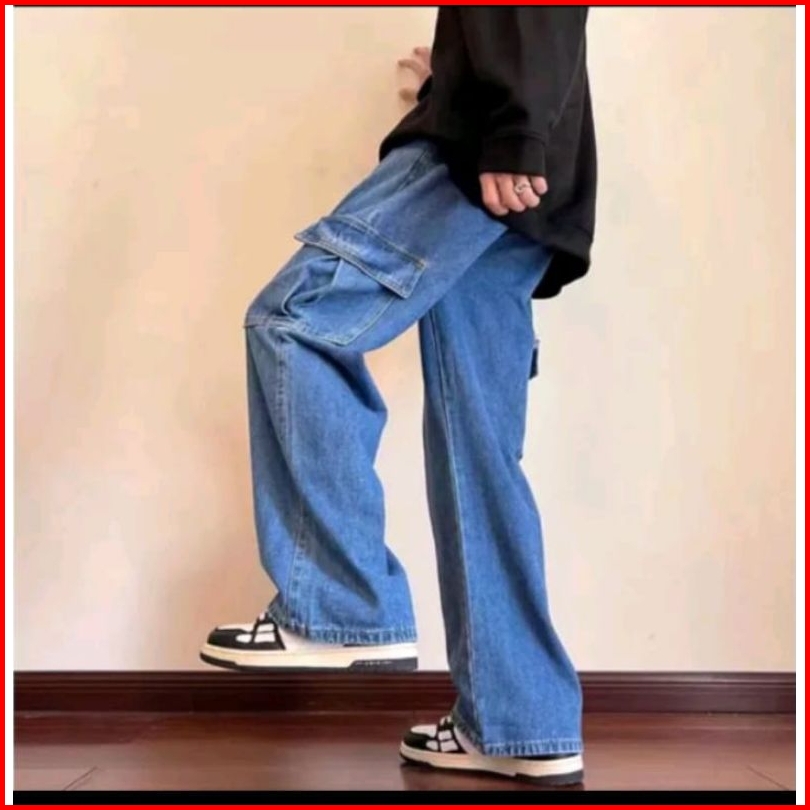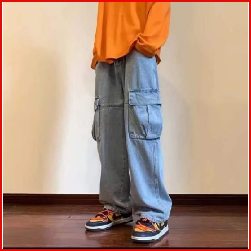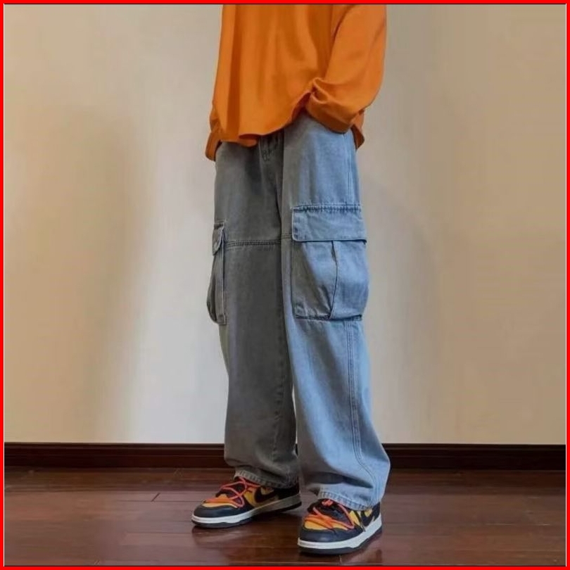 Celana Cargo Jeans Panjang Pria Loose Fit Gombrong Oversize Korean Style Kulot Baggy Pants