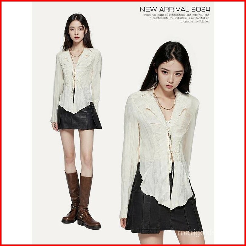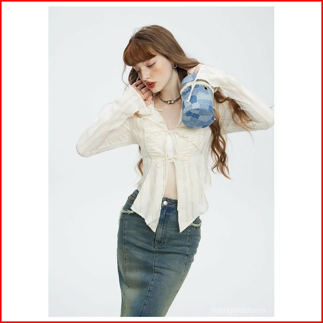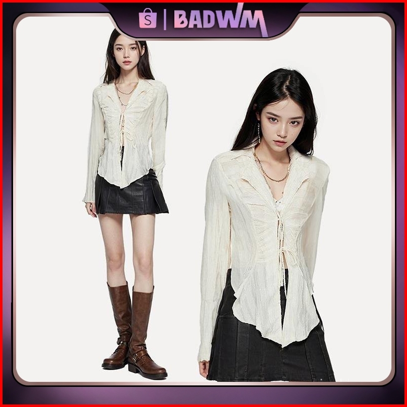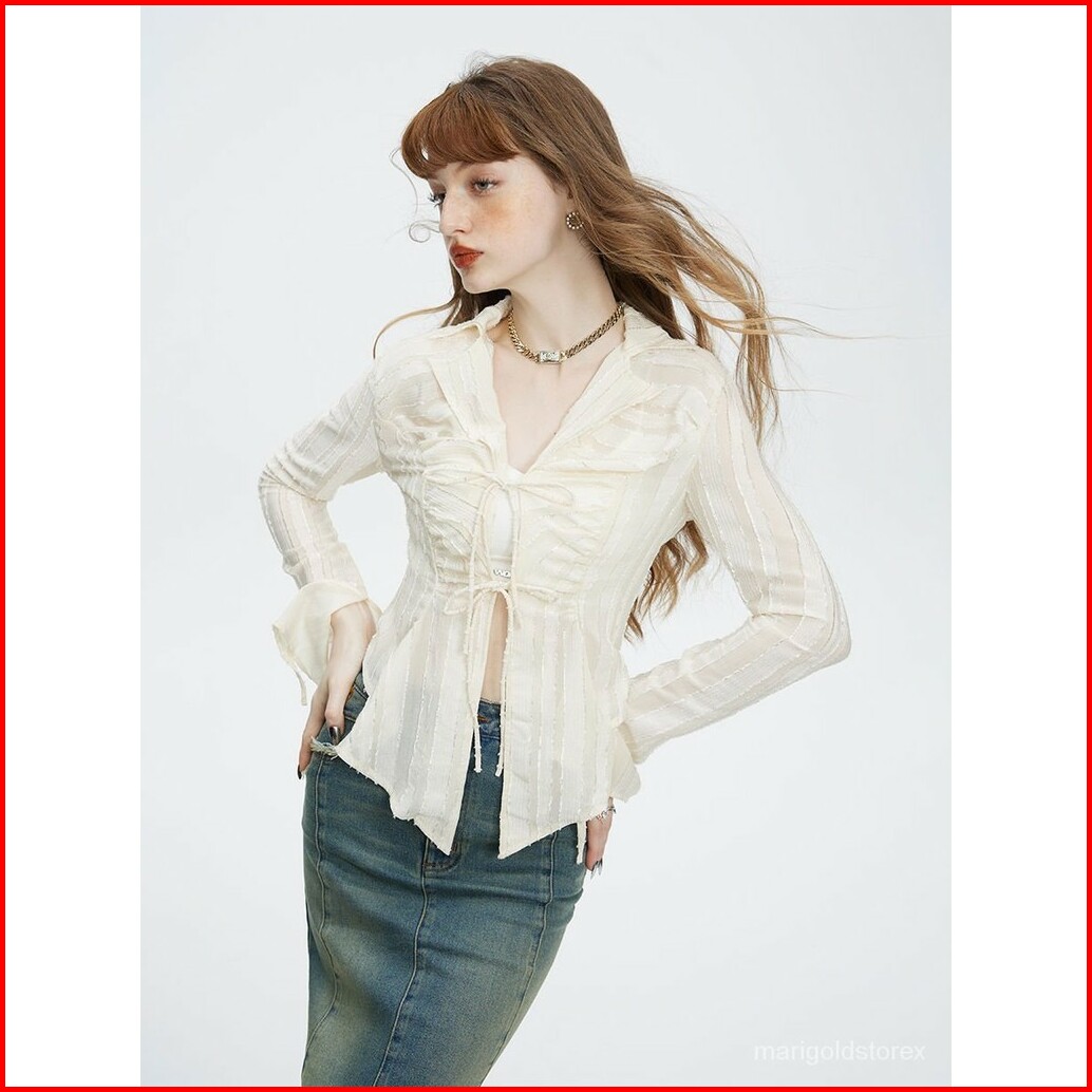 Kemeja Putih Pita Pita Atasan Chiffon Kemeja Kekinian Crop Wanita Lengan Panjang Kemeja Atasan Sifon