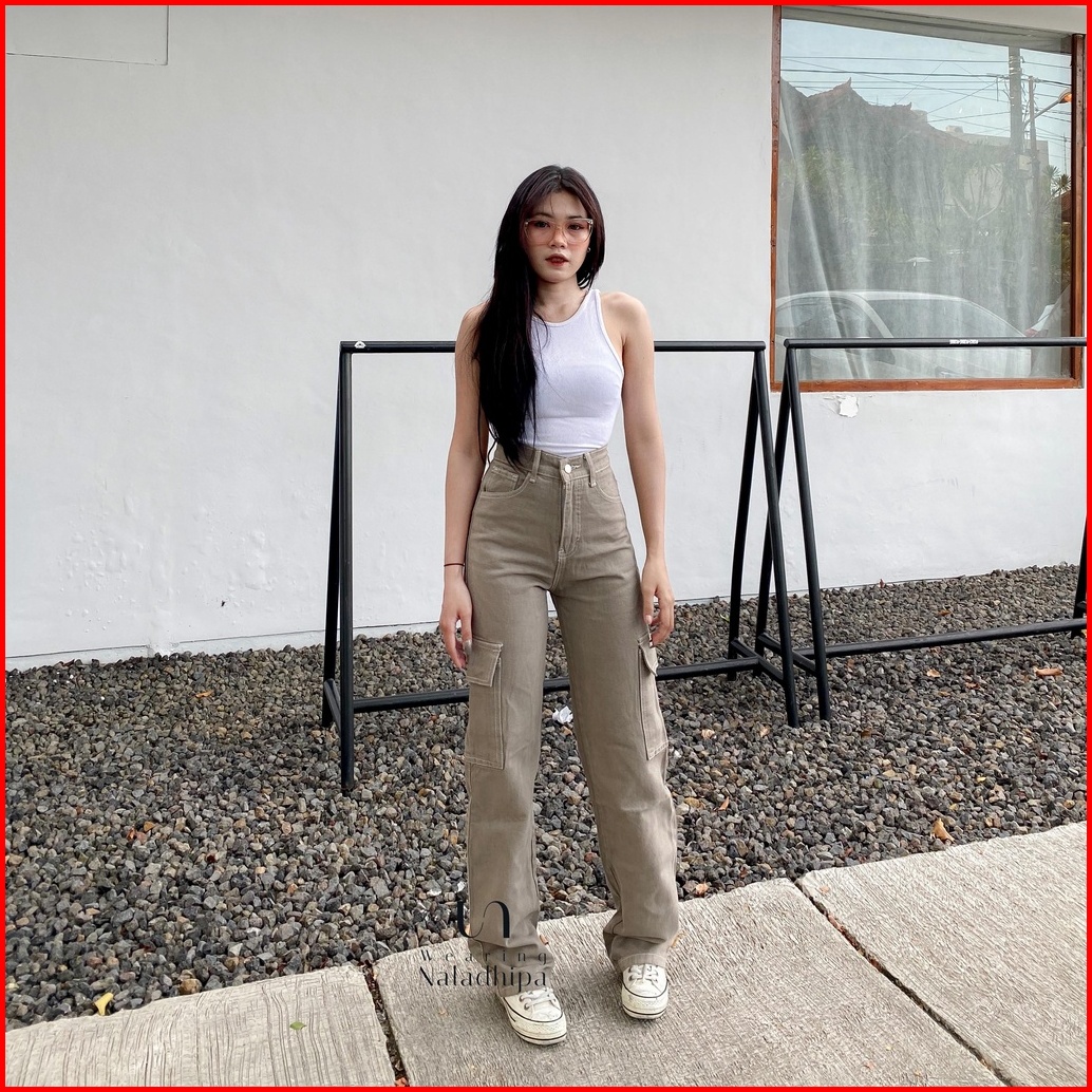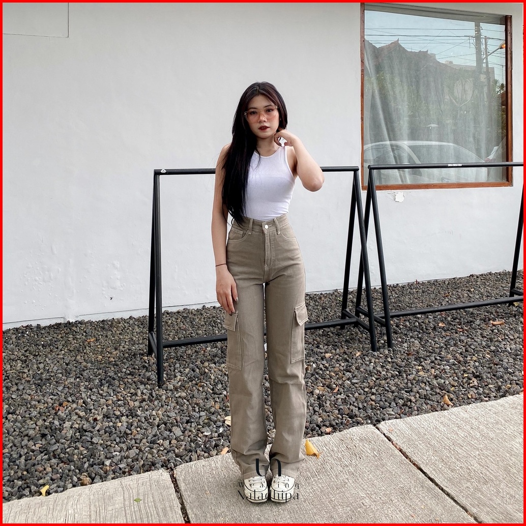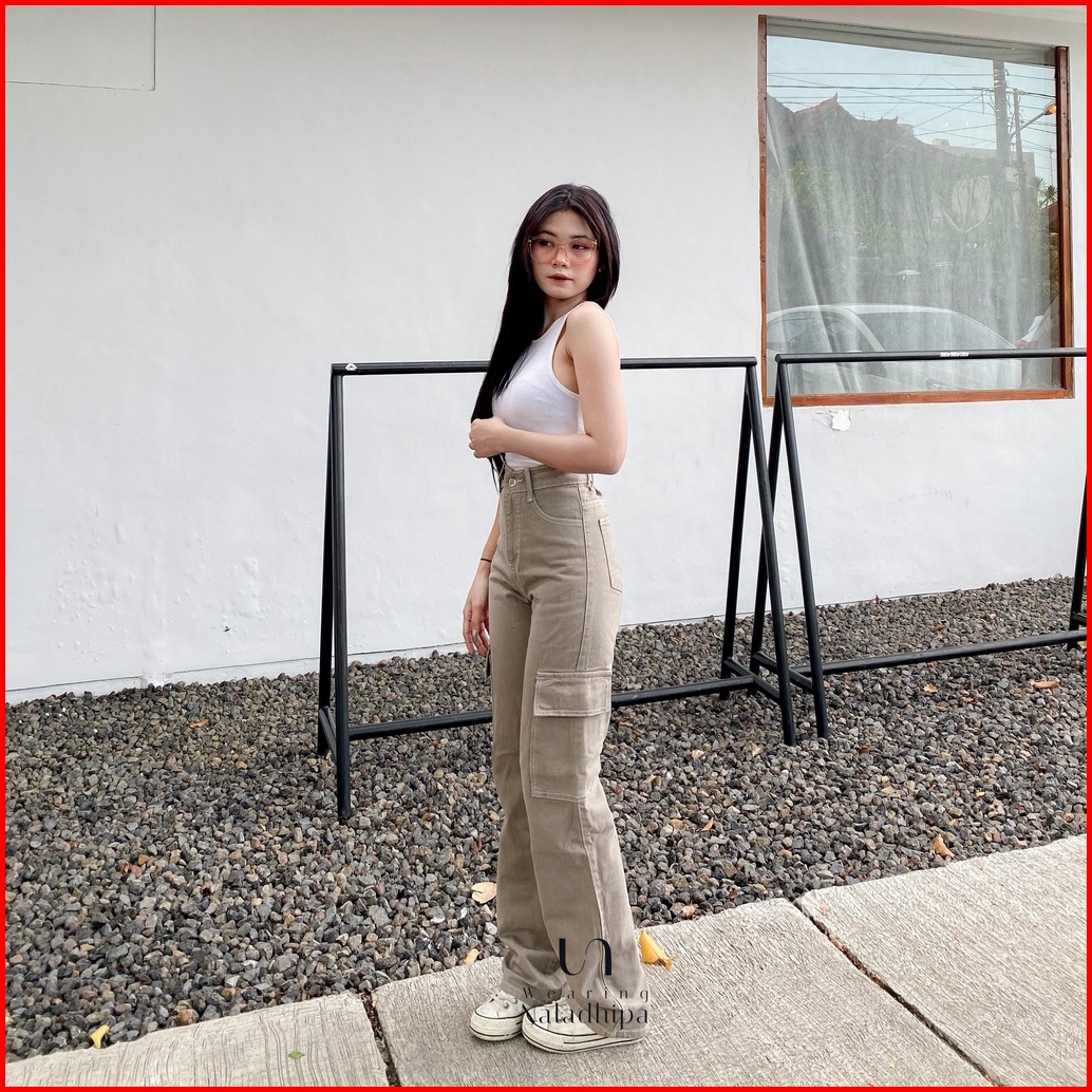 Tara Cargo Mocca - Highwaist Cargo Jeans Pants Wanita