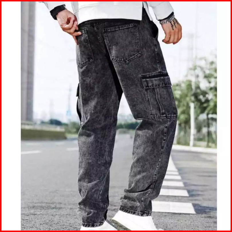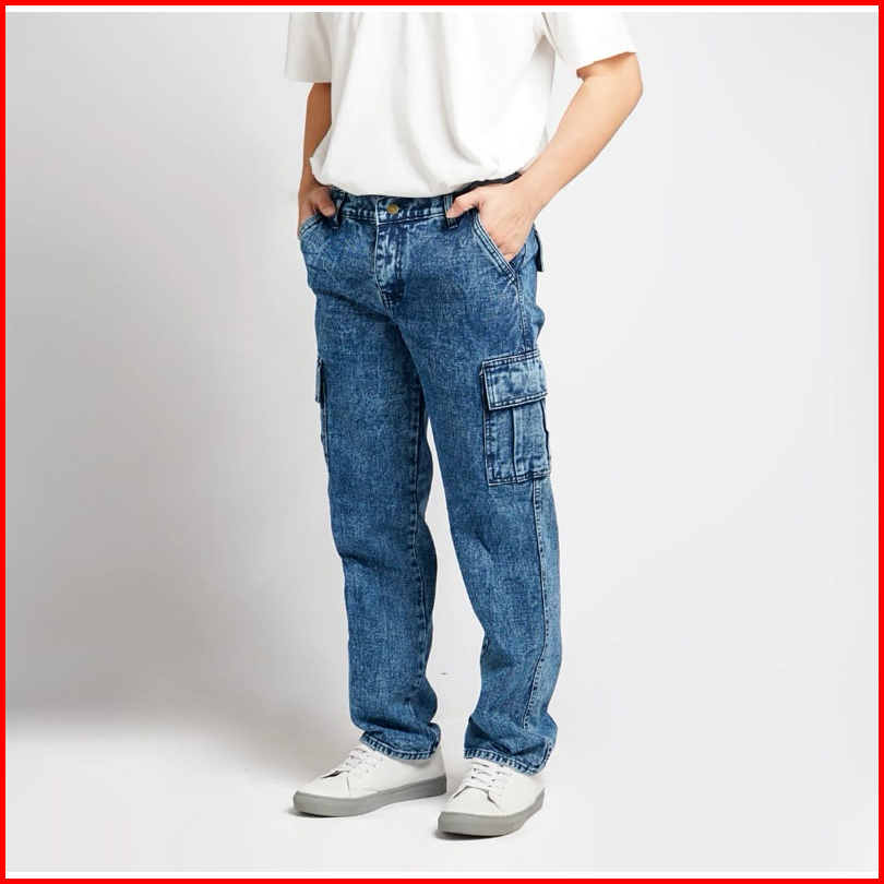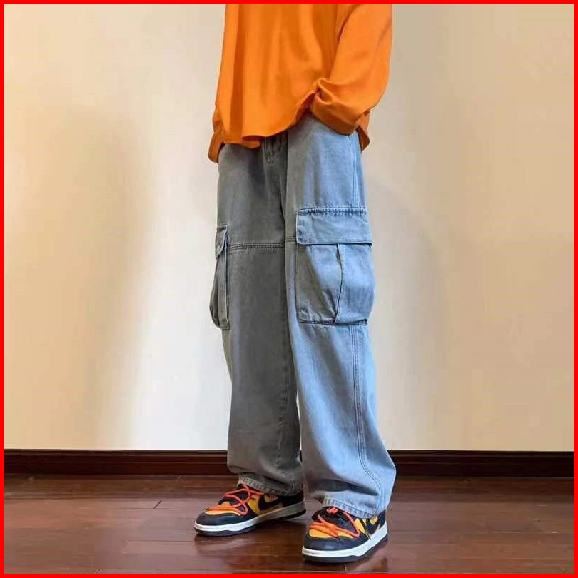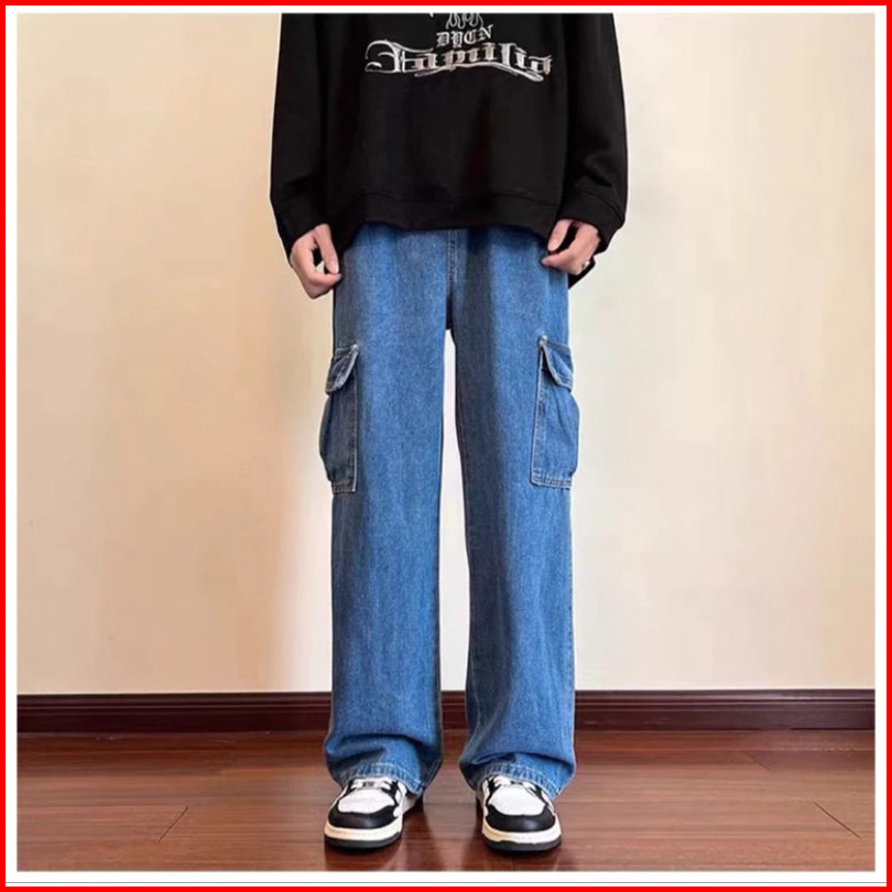 Celana Cargo Panjang Pria Gombrong Korean Style Loose Cargo Pants Blue Jeans Kulot Pants Denim Cowok