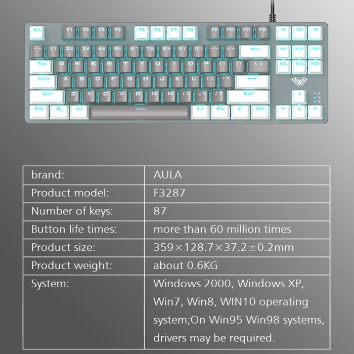 KEYBOARD GAMING F3287 AULA MECHANICAL 87 KEYS SWITCH MECHANICAL KEYCAPS 2 WARNA BACKLIGHT BIRU GARANSI 1 TAHUN