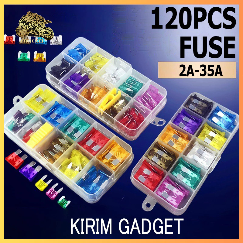 120pcs Sekring Tusuk Tancap Kecil Fuse Kotak Sekring Mobil Motor Auto 2A-35A 10 Spesifikasi