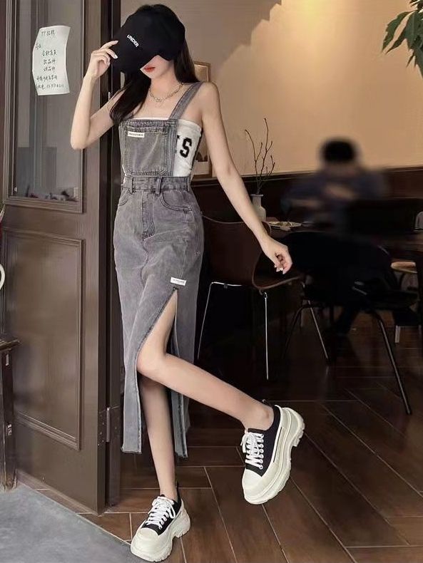 Rok Suspender Denim Abu Abu Belahan Samping Pinggang Tinggi Wanita
