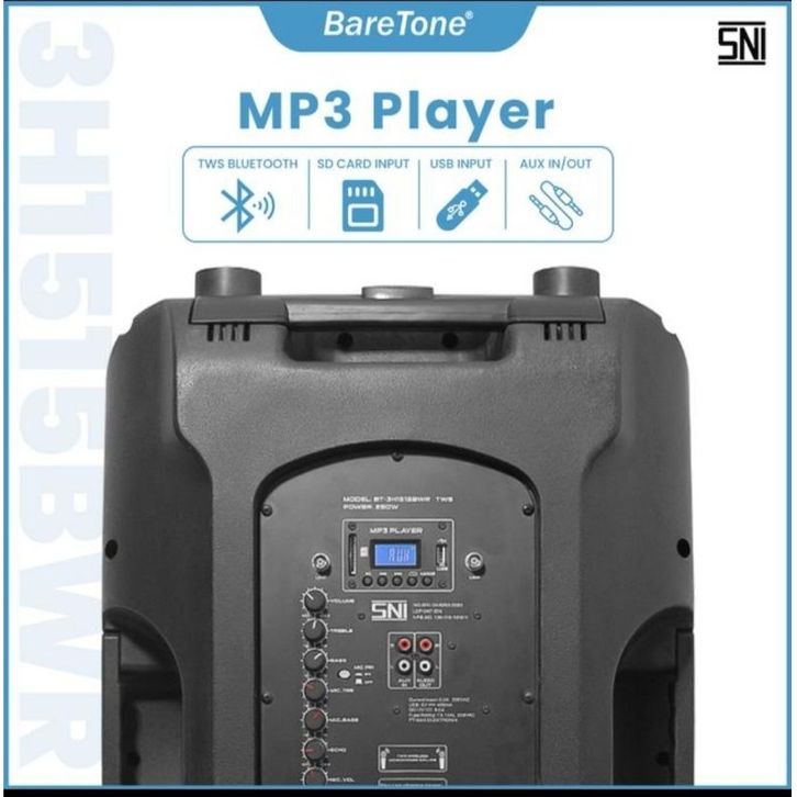 Speaker Portable Aktif 15 Inch RMS 250 Watt BARETONE BT-3H1515BWR / 15BWR Original Bluetooth TWS