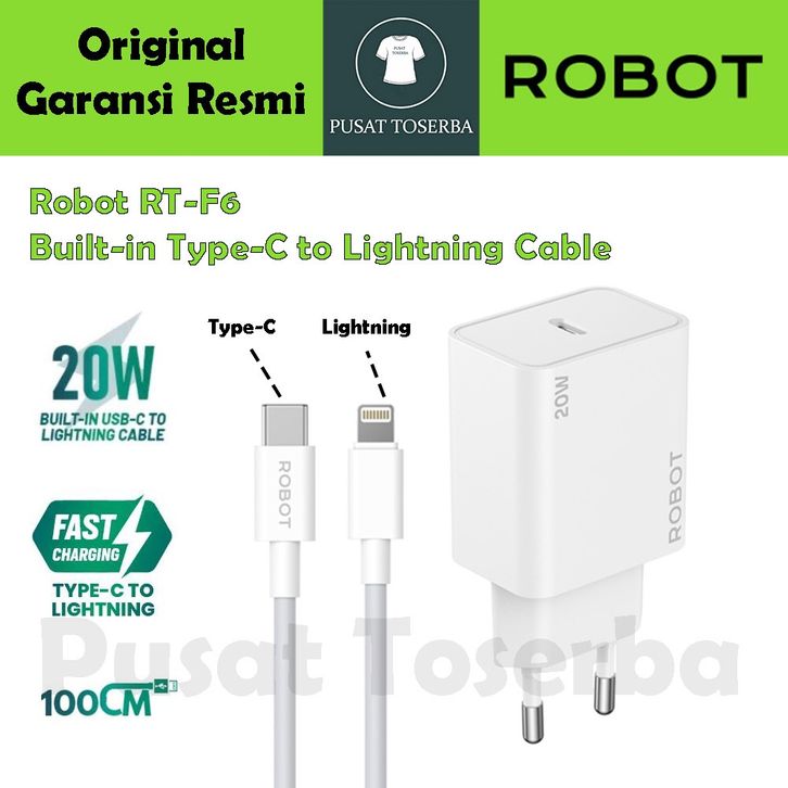 Charger Robot RT-F6 USB-C PD 20W /9ratis Kabel Type-C to Lightning For iPhone 5 s/d 14 Series - Original Garansi Resmi