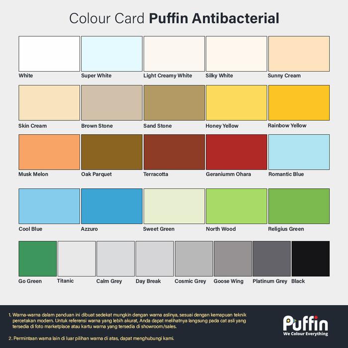 Azzuro, Black, Brown Stone, Calm Grey, Cool Blue, Cosmic Grey, Day Break, Geranium Ohara, Go Green, Goose Wing, Honey Yellow, Light Creamy White, Musk Melon, North Wood, Oak Parquet, Platinum Grey, Rainbow Yellow, Religius Green, Romantic Blue, Sand Stone, Silky White, Skin Cream, Sunny Cream, Super White, Sweet Green, Terracota, Titanic, White