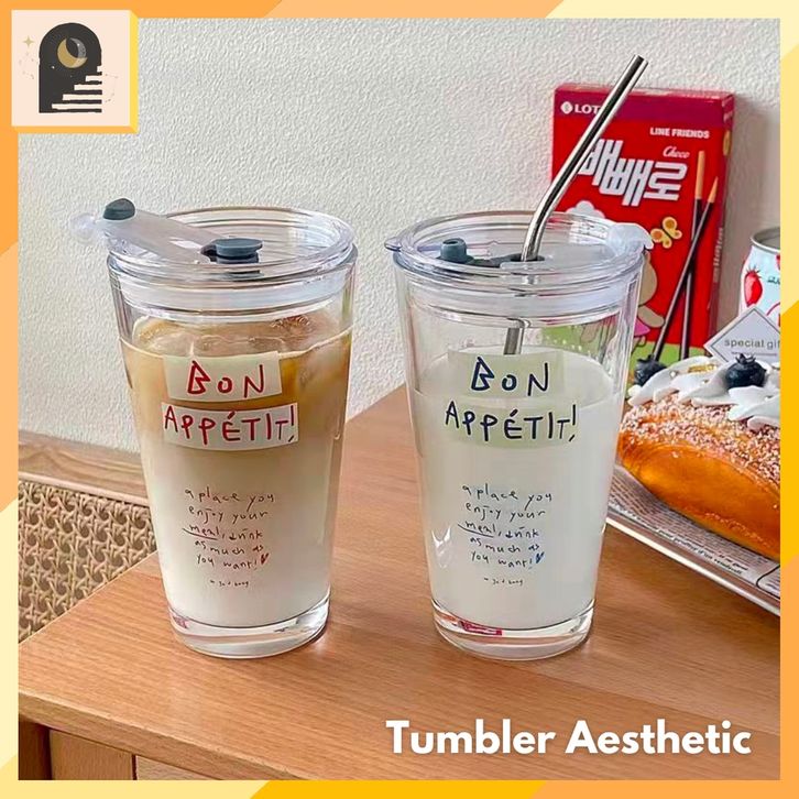 TERMURAH Either.id - Tumbler Gelas Kaca Botol Minum Aesthetic Mug Kopi Cup Glass Dengan Case dan Sedotan igibg