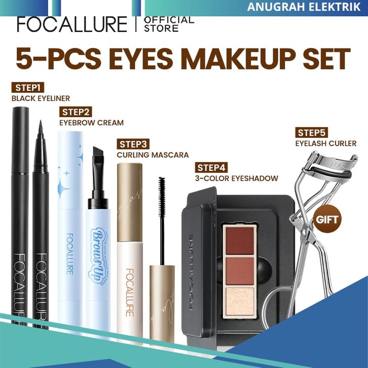 FOCALLURE 5PCS Eyes Makeup Set Eyeliner Eyebrow Mascara Eyeshadow Eyelash Curler
