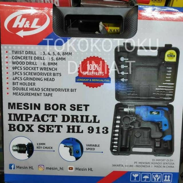 Mesin Bor Listrik Set H&L 13mm Impact Drill Box Set Komplit HnL HL913