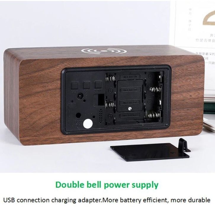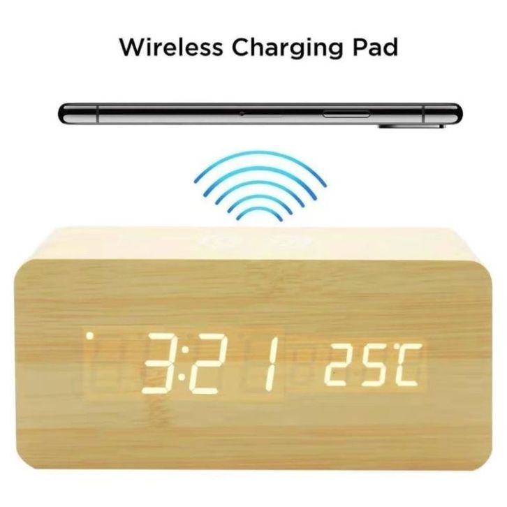 Jam Kayu Digital Wireless Charging Jam Weker Led Motif Wooded Alarm LED Clock Waker Suhu Tanggal Jam Meja Digital Kerja