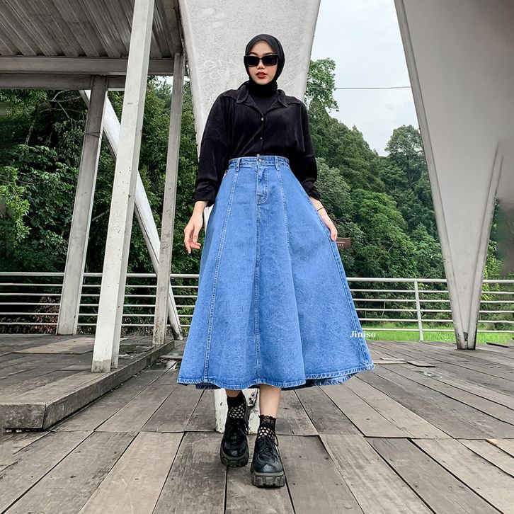 Rok Jeans A Line Rok Jeans Ruffle Rok Jeans Wanita Remaja Modis Simple Elegan Terbaru JINISO 902 Seventy