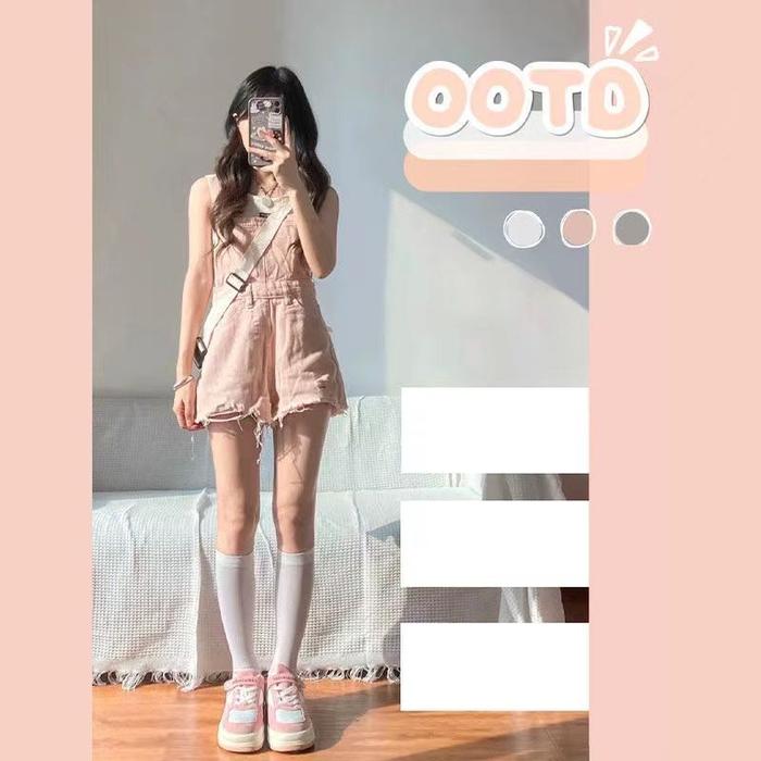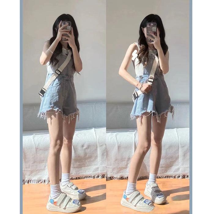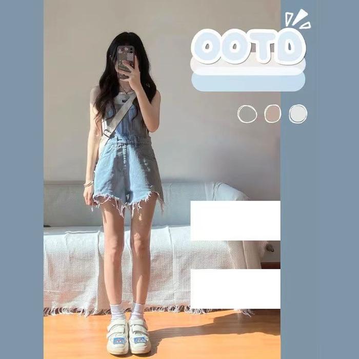 Xj0052 Umpsuit Pendek Wanita Gaya Korea Jumpsuit Panjang Hitam Jeans Setelan Denim - S 40-50Kg, Biru