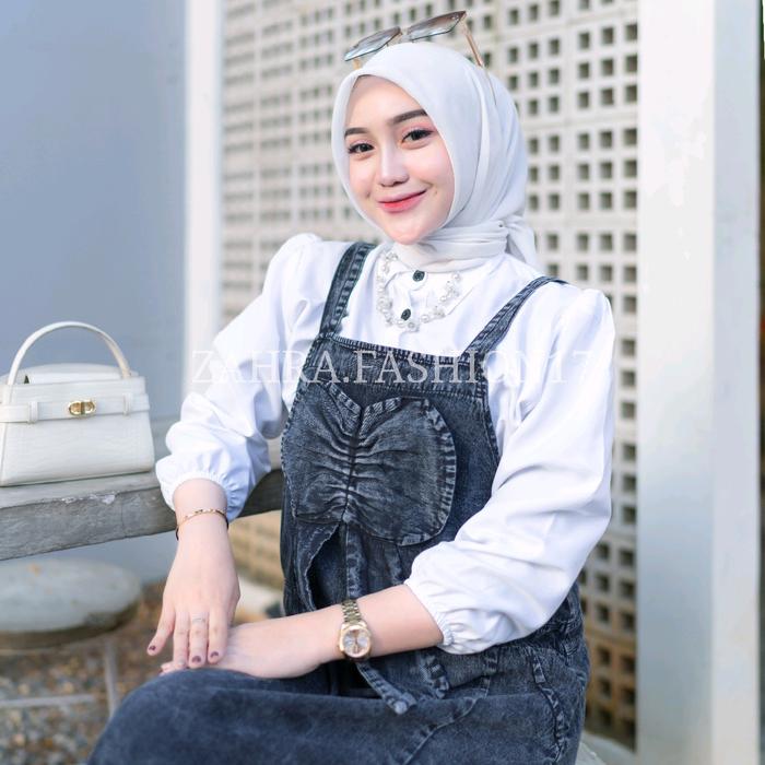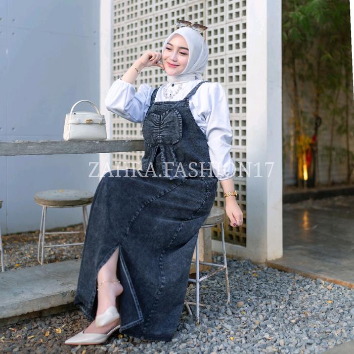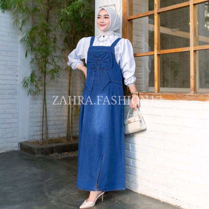 One Set Overall + Kemeja Wanita Zahra Terbaru Model Kekinian Cantik Nyaman Soft Denim Panjang Dress Jeans Katun Casual I