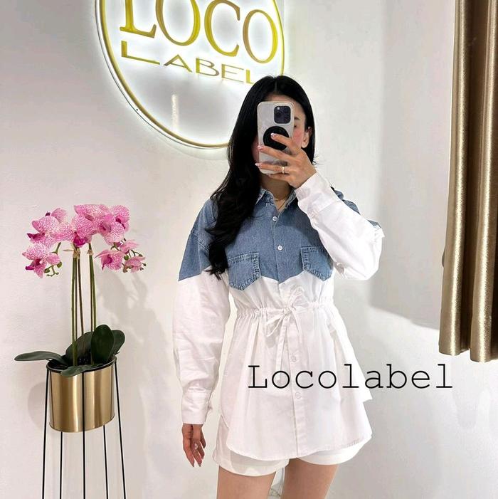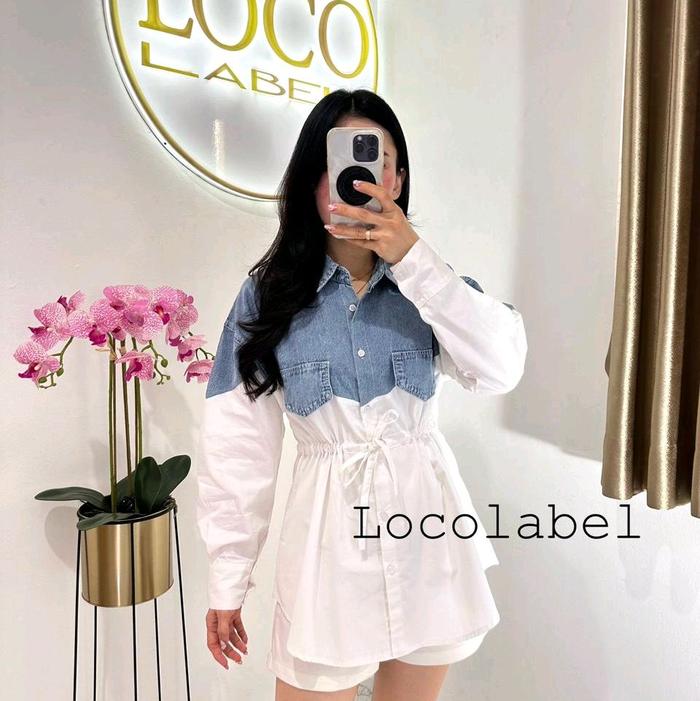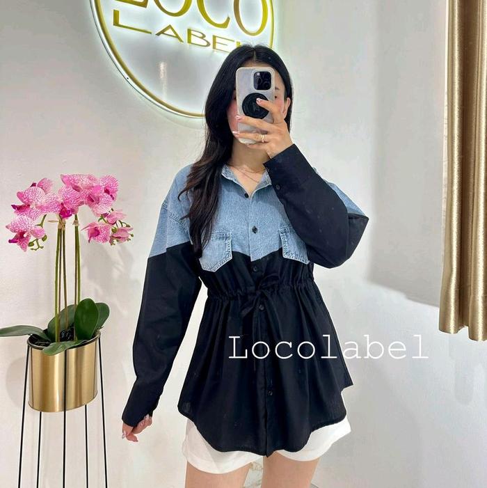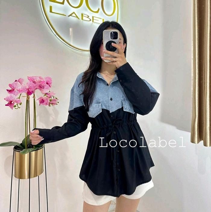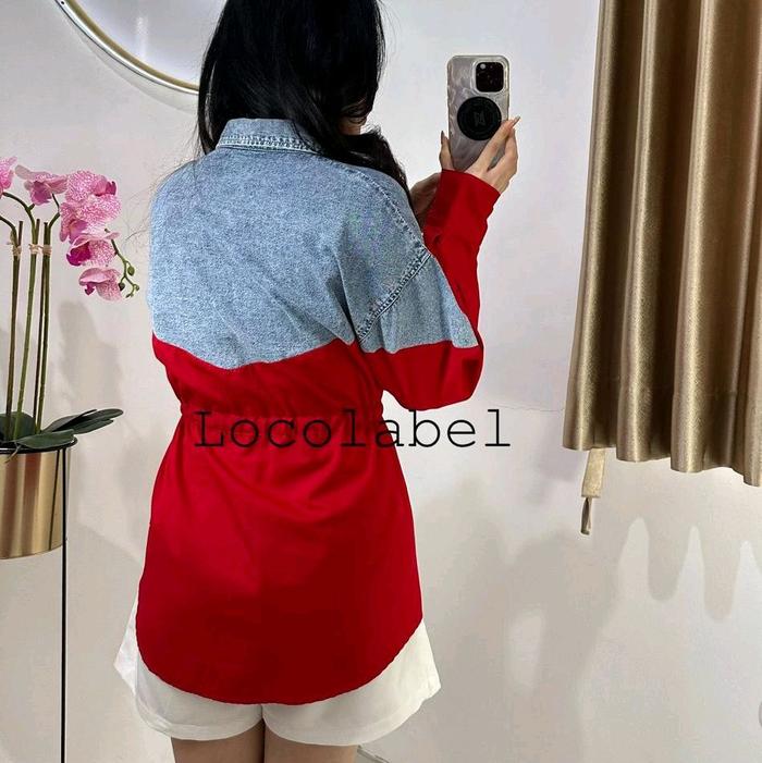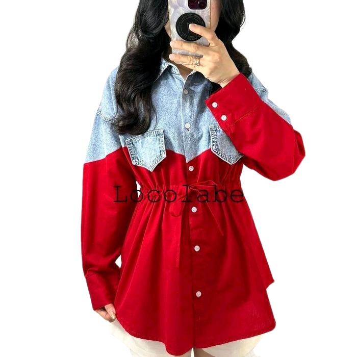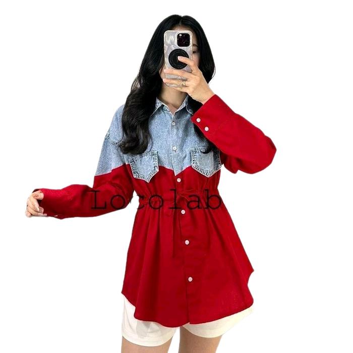 Locolabel - [Ld : 114Cm] Violla Denim Shirt Tangan Panjang Serut Atasan Wanita - Red