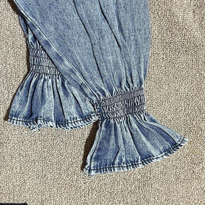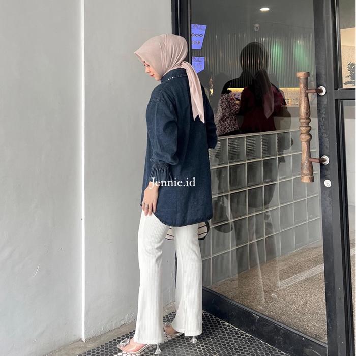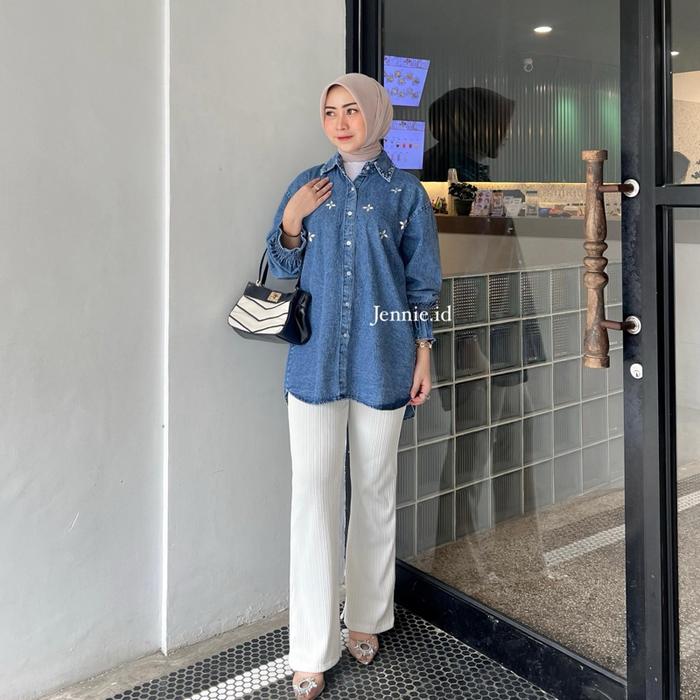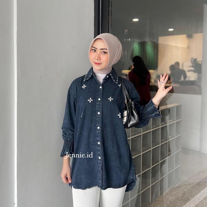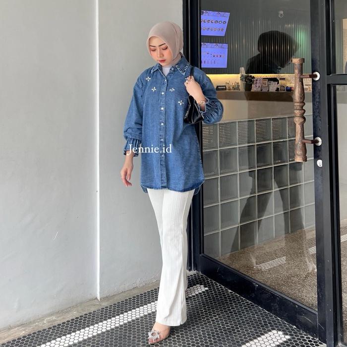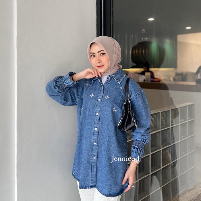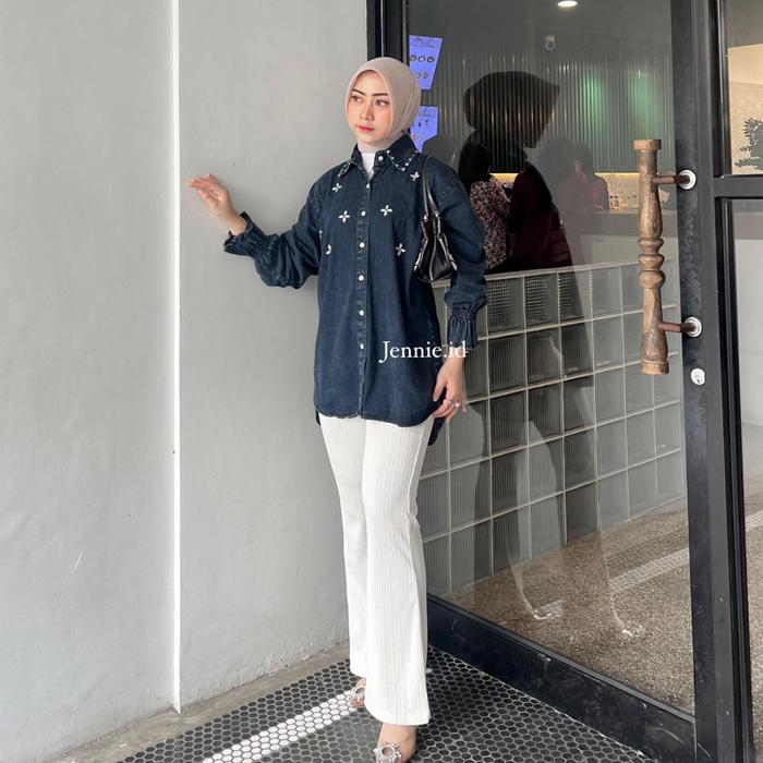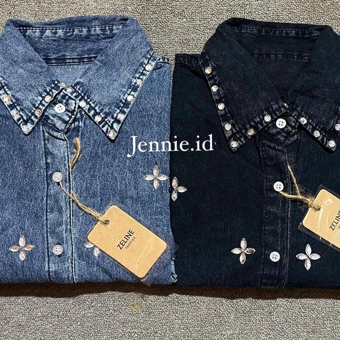 Raline Kemeja Jeans Wanita Atasan Jeans Payet Lengan Panjang Casual Cewek - Snow Black, Ld 110Cm