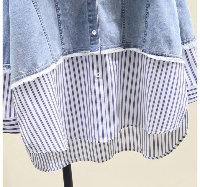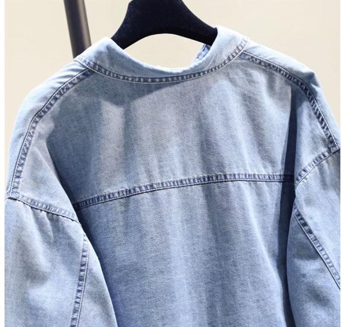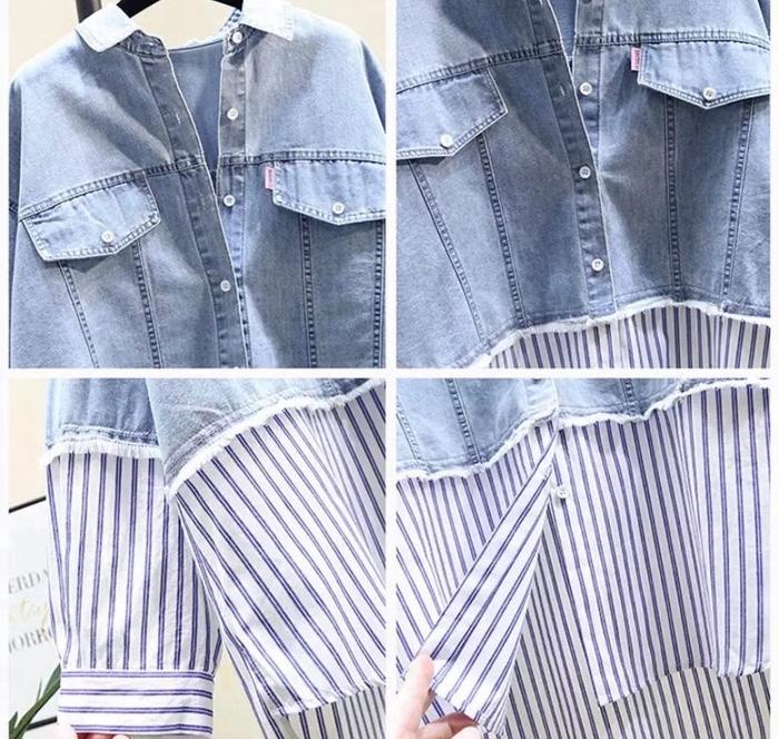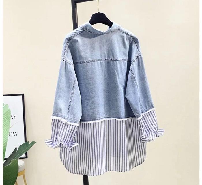947- Kemeja Jeans Atasan Wanita Kombinasi Salur Nyaman Panjang Grey Tebal Pesta Baju Soft - Light Snow Grey, L / Xl