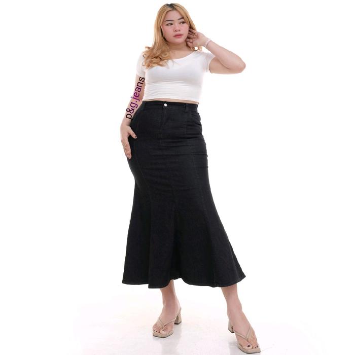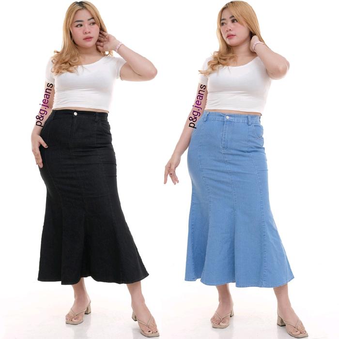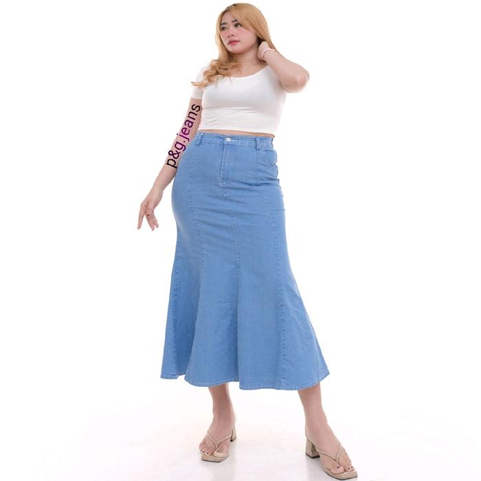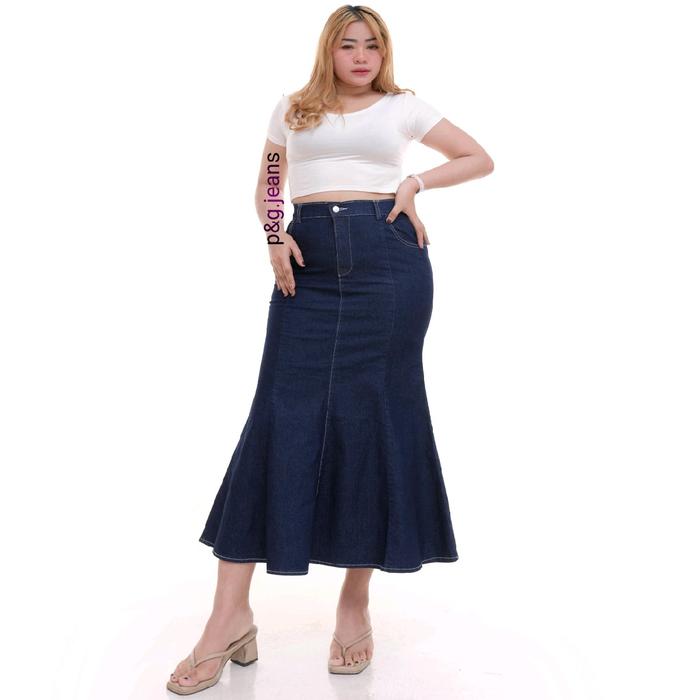 Pg Jeans - Mermaid Skirt Rok Duyung Denim Wanita Casual Jeans Kancing Karet Panjang - Navy, Standar