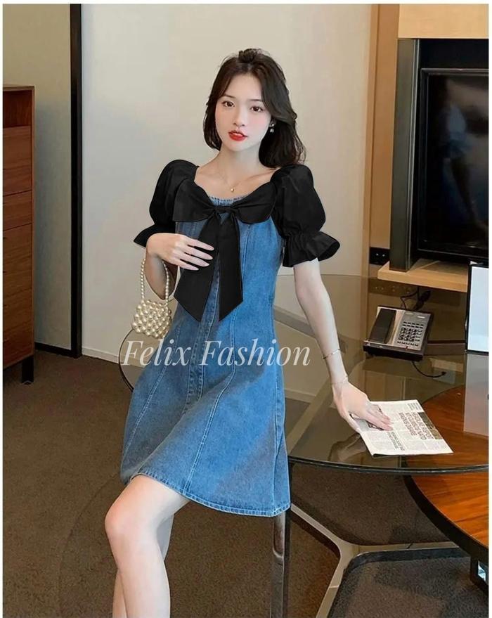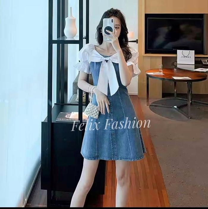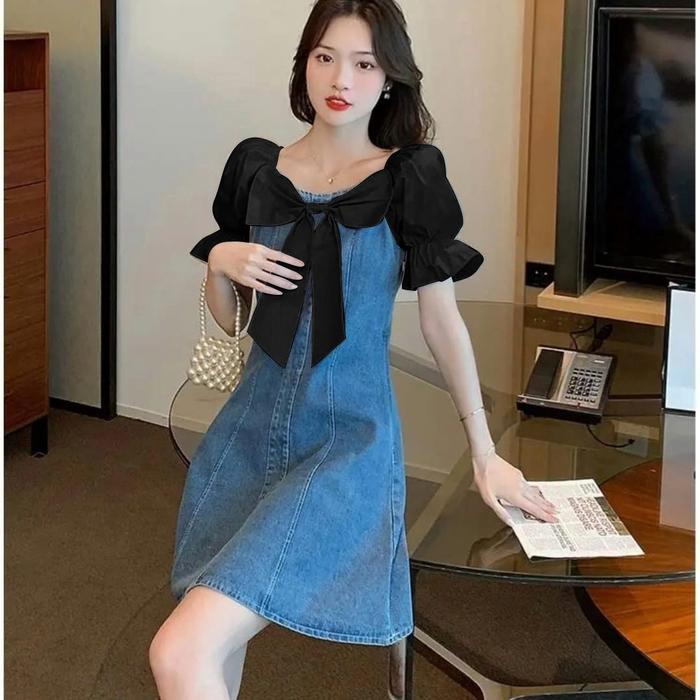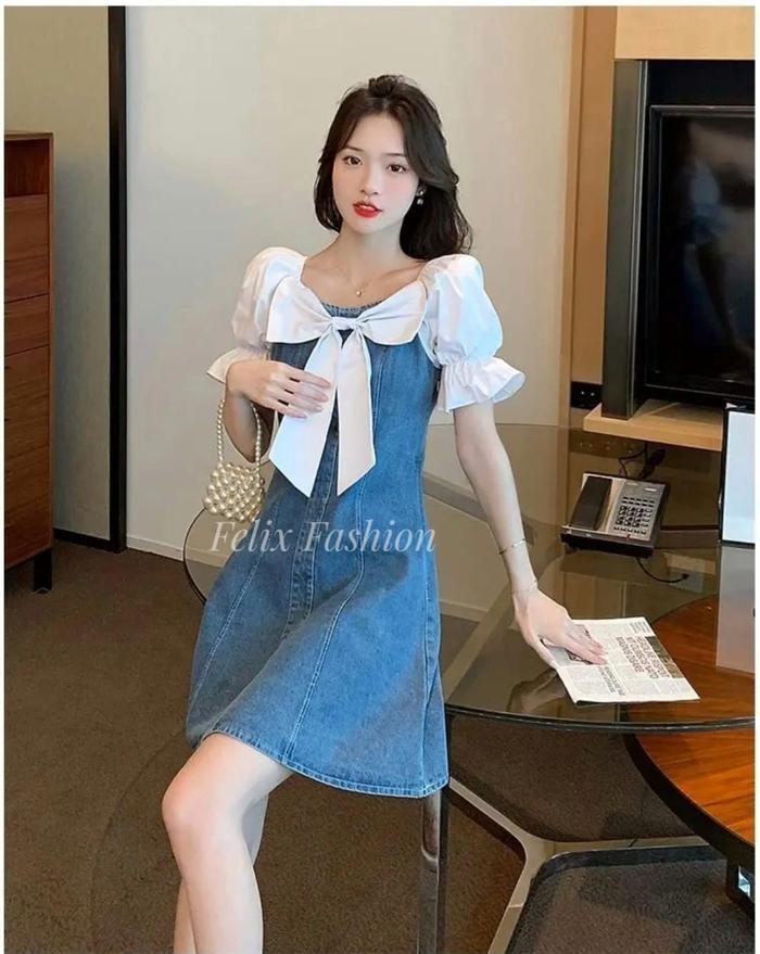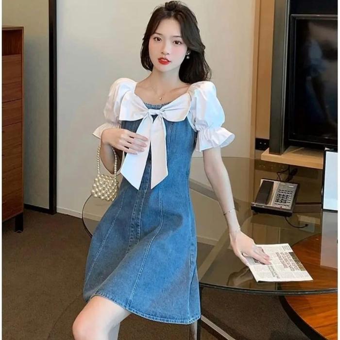 Dress Jeans Wanita Lengan Pendek Karet Kombinasi Katun - 942-Light Snow-Putih, L