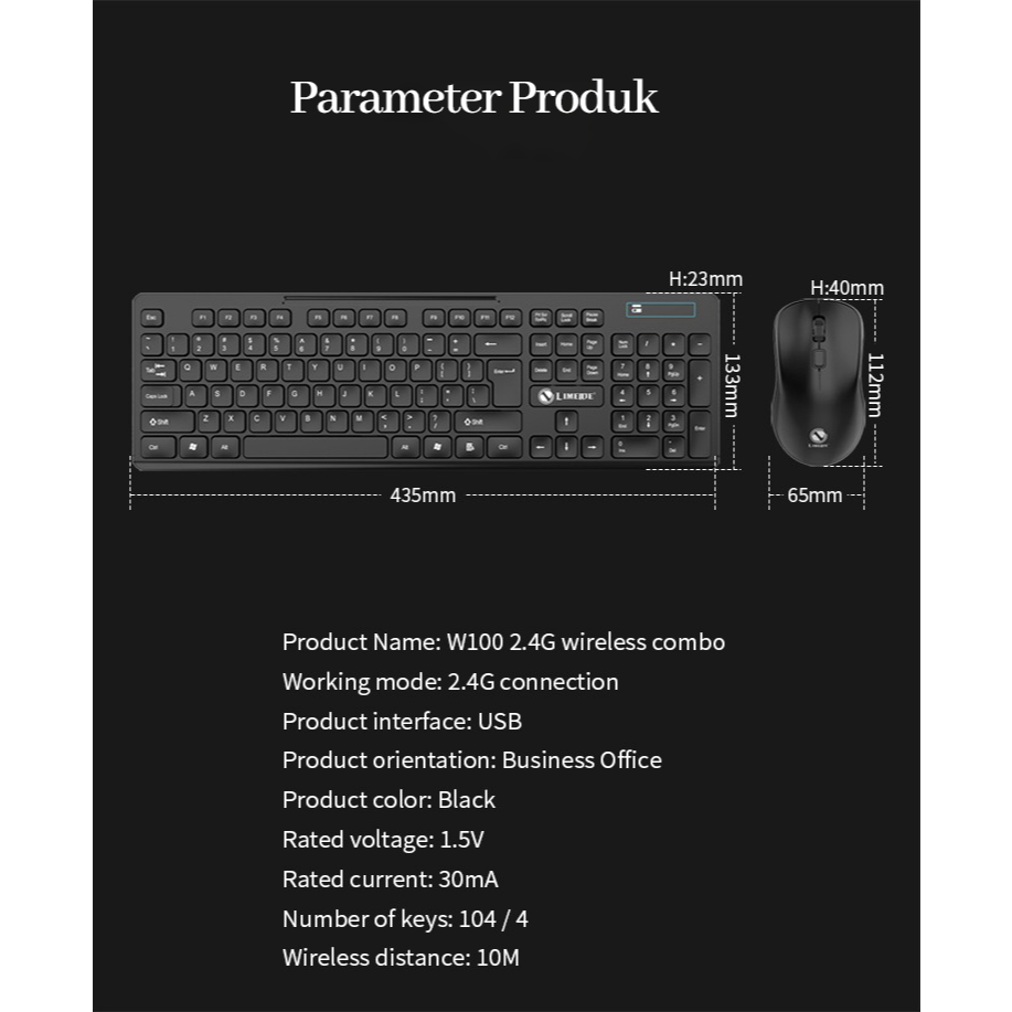 MA Keyboard Portable Wireless Set Combo Keyboard dan Mouse Tanpa Kabel Tipe W100 Original Keyboard untuk PC Desktop dan Laptop Garansi 1 Tahun