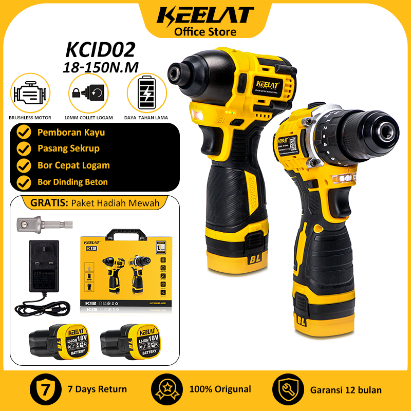 KEELAT-KCID02 2 IN 1 150NM Brushless Cordless Mesin Bor 18V Impact Driver Obeng Listrik