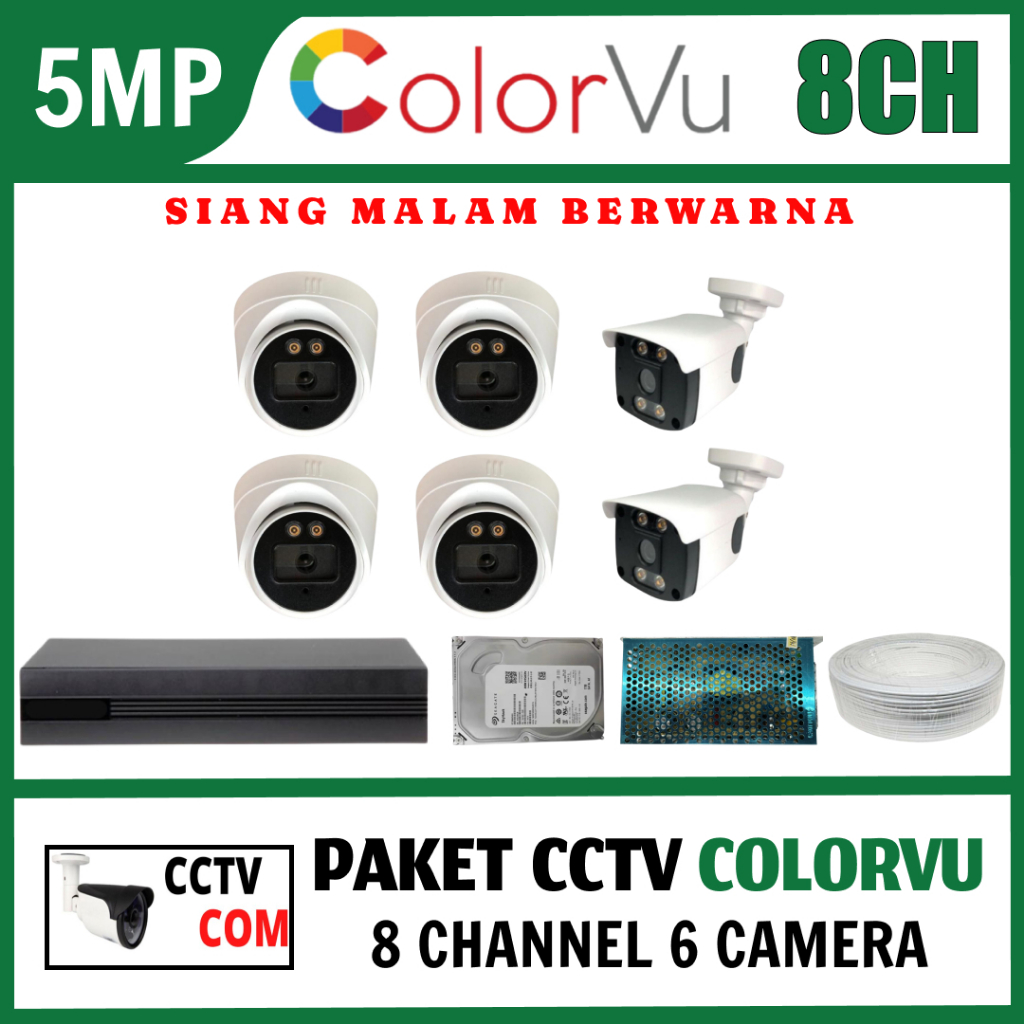 PAKET CCTV COLORVU -SIANG MALAM BERWARNA 8 CHANNEL 6 CAMERA 5MP IC SONY 1080P KOMPLIT TINGGAL PASANG