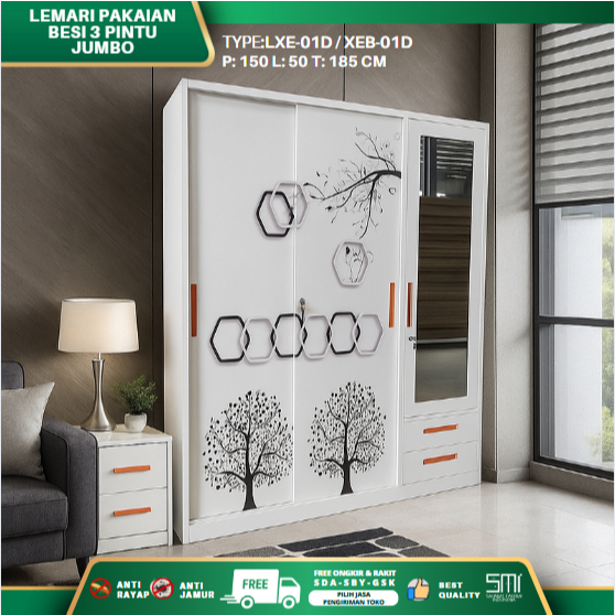 [Mall] Lemari Sliding 3 Pintu Lemari Sliding Besi Lemari Pakaian Besi Dengan Kunci Laci Kaca Cermin Anti Rayap Termurah
