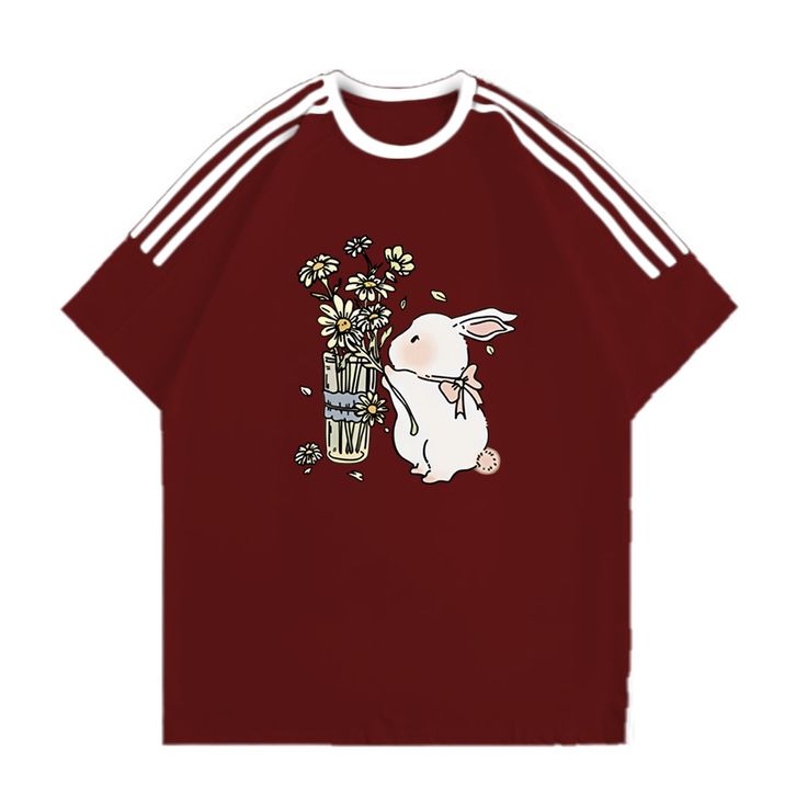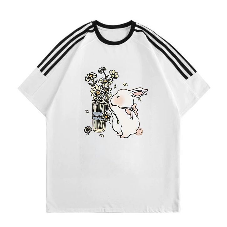 Jessica Tshirt Lengan Pendek Baju Kaos Oversize Garis Tiga Motif Kelinci Bunga Bahan 100% Cotton