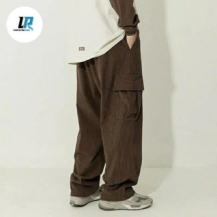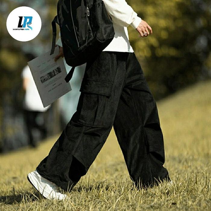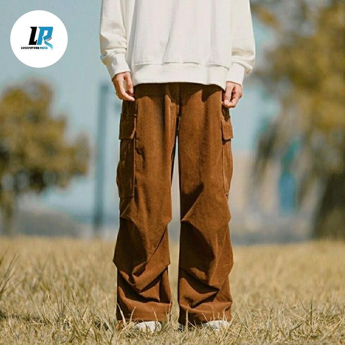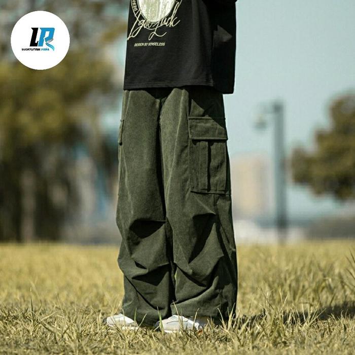 Celana Cargo Corduroy pria hijau baggy loose pants gombrong Casual Santai Nyaman Panjang - Hijau, 27