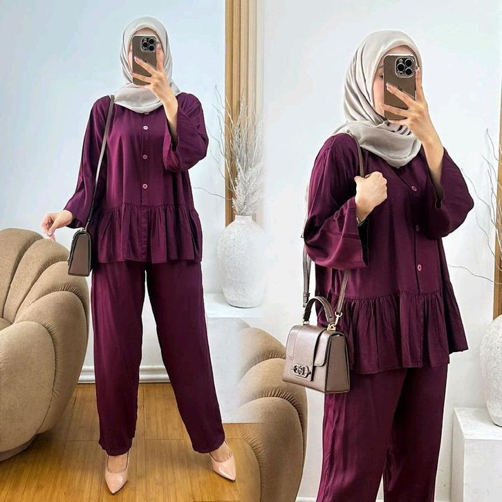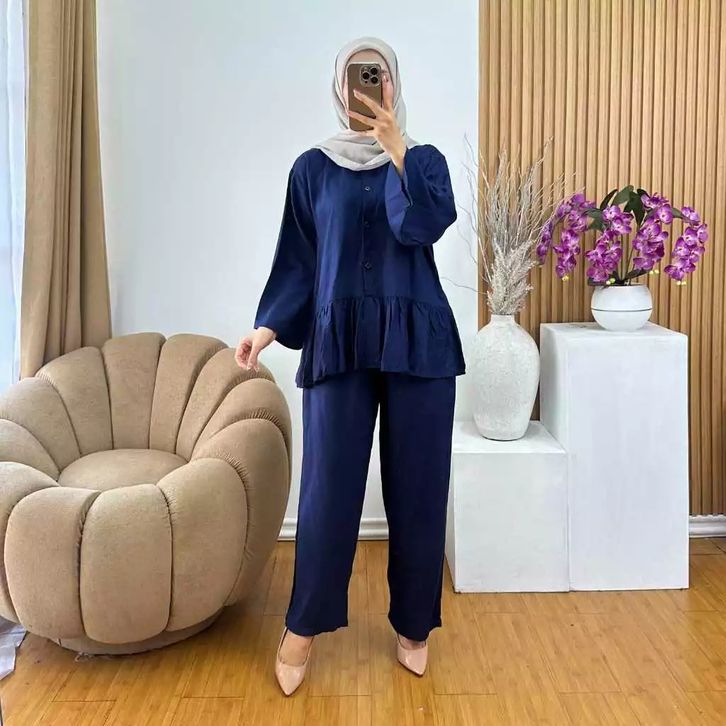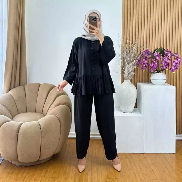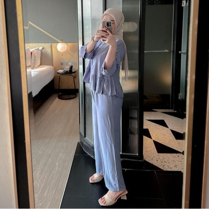 Setelan Baju Aghnia Agnia Set Rayon Twill Atasan Rempel & Celana Wanita Kekinian 2026