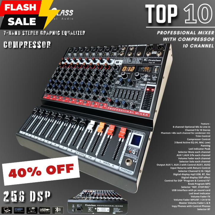 Mixer Firstclass Top 10 Top10 10 Chanel Efek Digital Reverb 256dsp Compress USB Bluetooth