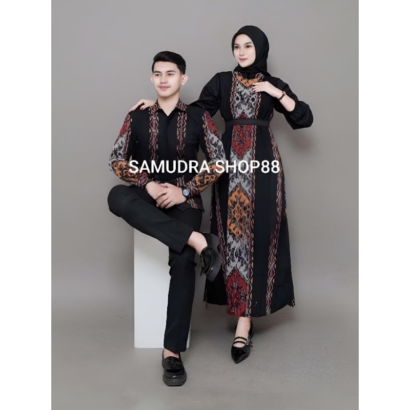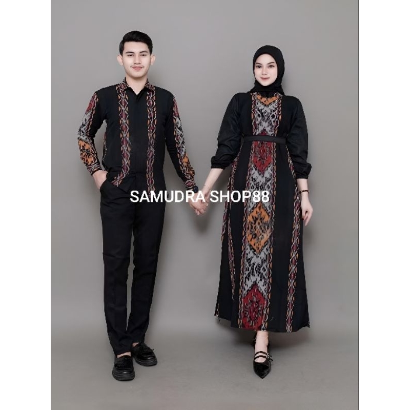 Baju Couple Batik Tenun Fatma Hitam Maron Kemeja Pria dan Gamis Kondangan