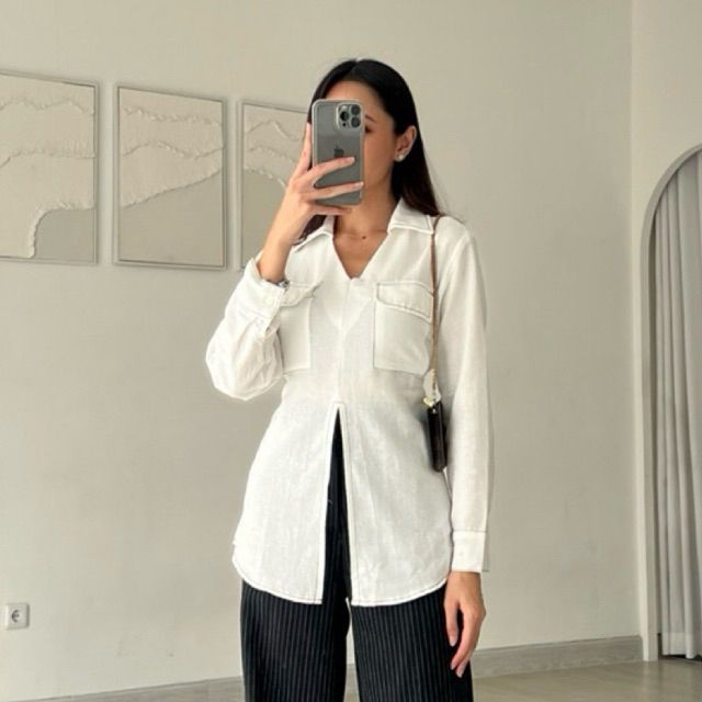 SORINBYHER Miranda Longsleeves Pocket Slit Shirt / Atasan Kemeja Wanita Linen dengan tali pinggang blouse lebaran