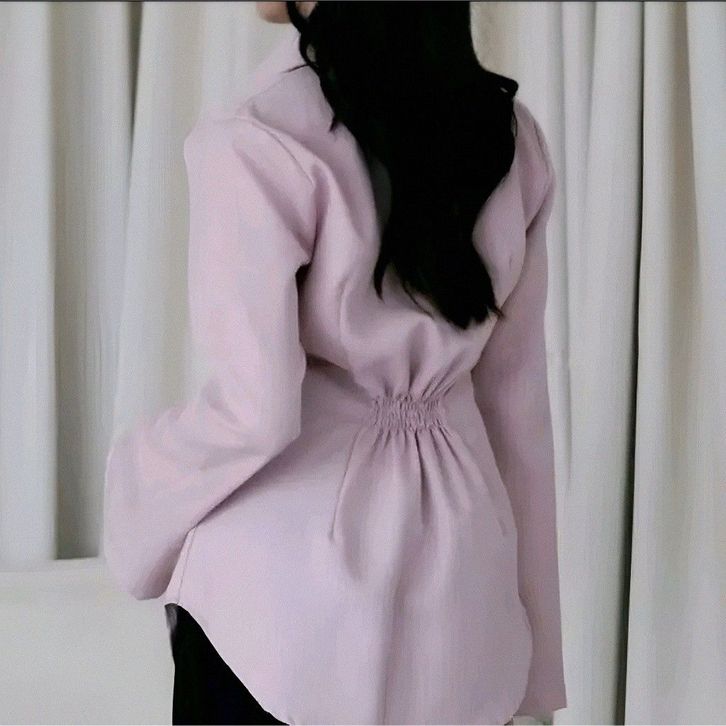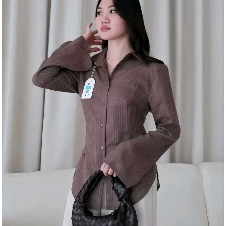 Kemeja Wanita Stripe Lengan Flare Panjang - Atasan Kemeja Wispi Kemeja Wanita Kerja Press Body Salur Kerah Basic Kemeja