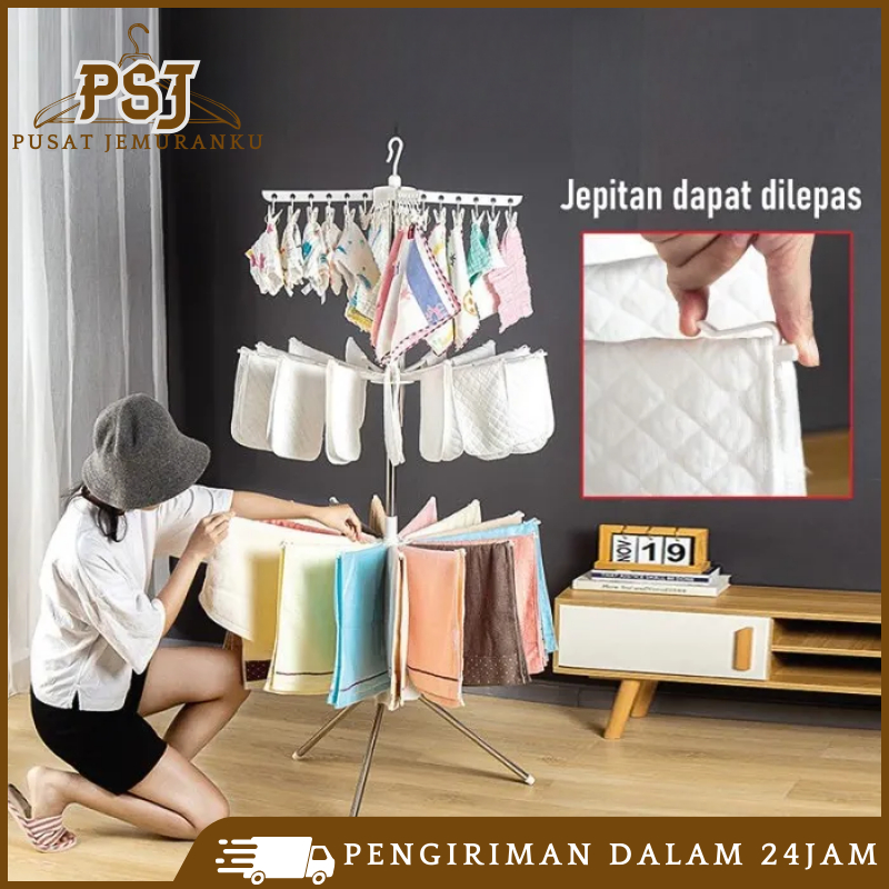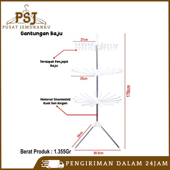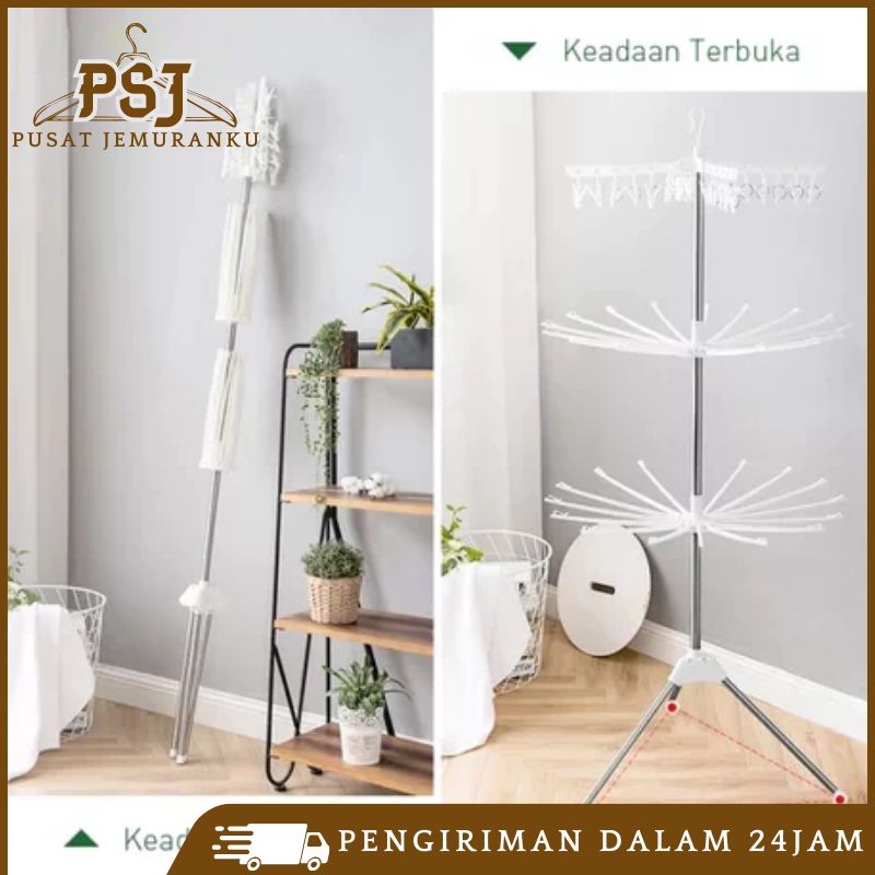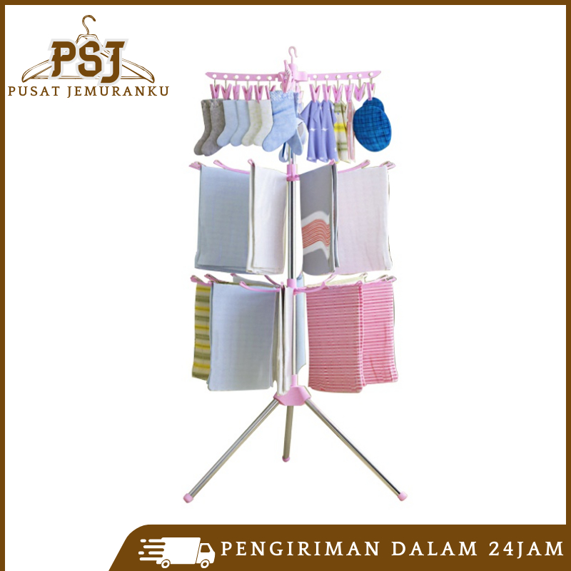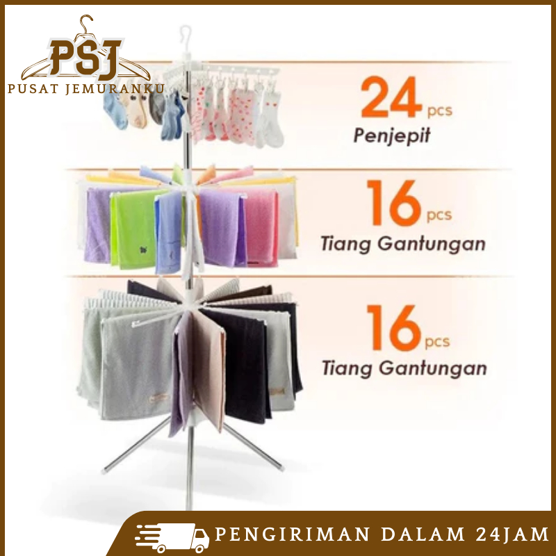 Jemuran Menara 3 Susun 16 Jari-Jari 24 Jepitan Rak Jemuran Baju Lipat Rak 3 Tingkat Mjj-2