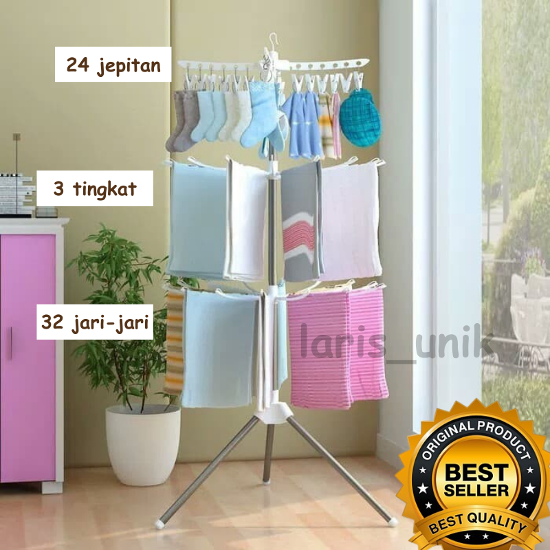 MJJ-2 Rak Jemuran Baju Warna Putih 16 jari-jari 3 Tingkat Gantungan Menara Kokoh Stainless 24Jepitan