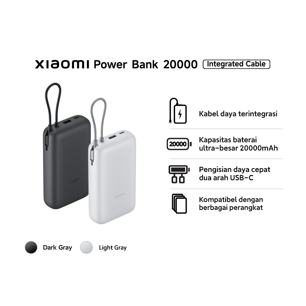 Xiaomi Power Bank 20000mAh (Integrated Cable) | Kabel Daya Terintegrasi | Kapasitas Baterai Ultra-Besar 20000mAh | Pengi