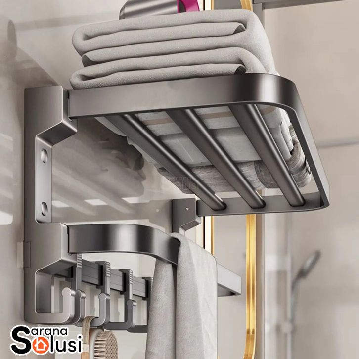 Rak Dinding Kamar Mandi 2 Layer 9 Hook Gantungan Handuk Lipat Aluminium