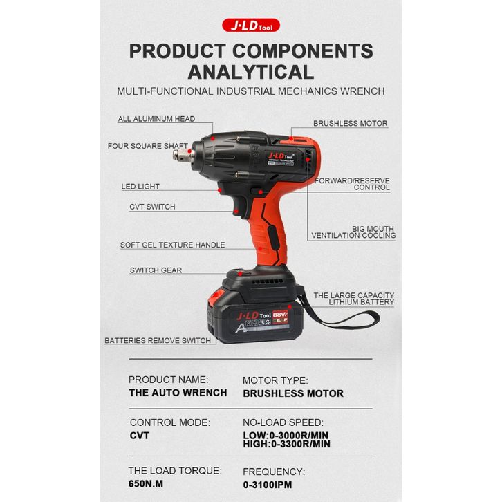 Bor Impact Baterai JLD 650NM Brushless 88VF Impact Wrench cordless bisa bolak balik 13MM Mesin bor impact baterai torsi