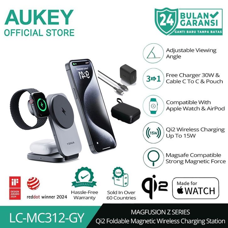 AUKEY Magnetic Wireless Charger 15W 3 In 1 MFI With Port Type C LC-MC312