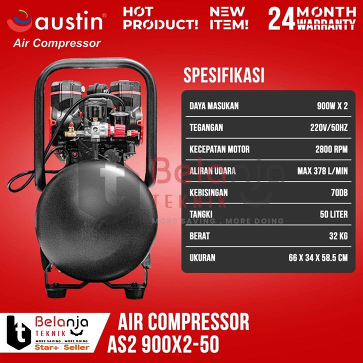 Mesin Kompresor Udara Tanpa Oli Austin AS2 900X2-50 Air Compressor Oilless 50 L
