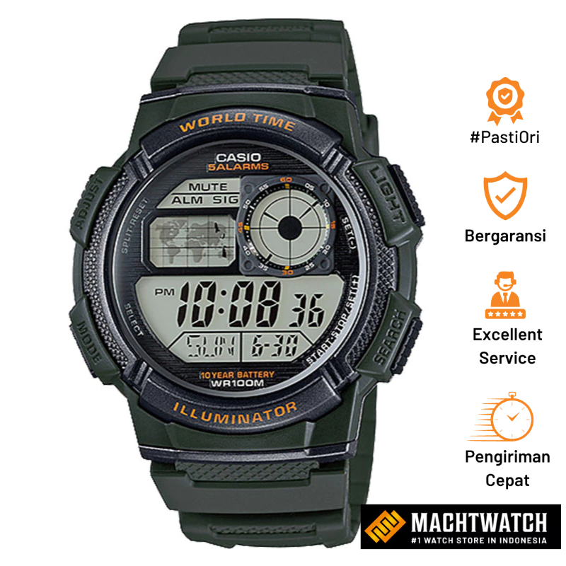 Jam Tangan Pria Digital Casio General AE-1000W-3AVDF AE1000W Battery Water Resistance 100M Green Resin Band