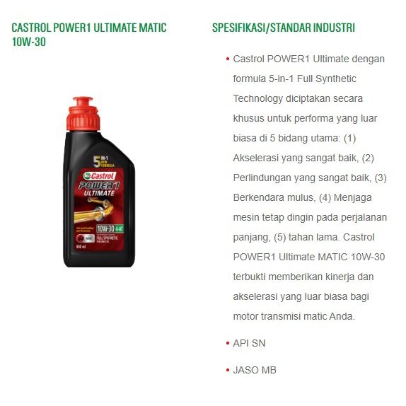 Castrol Power1 Ultimate Matic 10W30 (0,8L) Oli Motor Full Sintetis