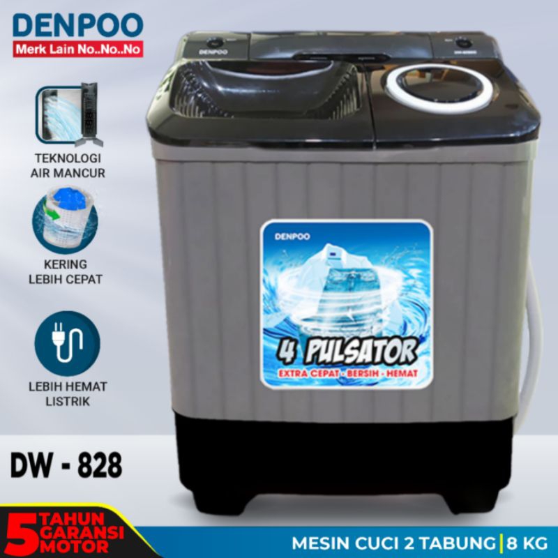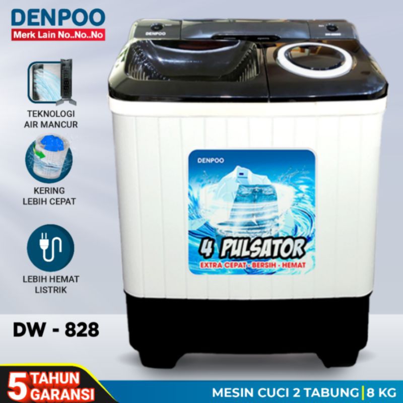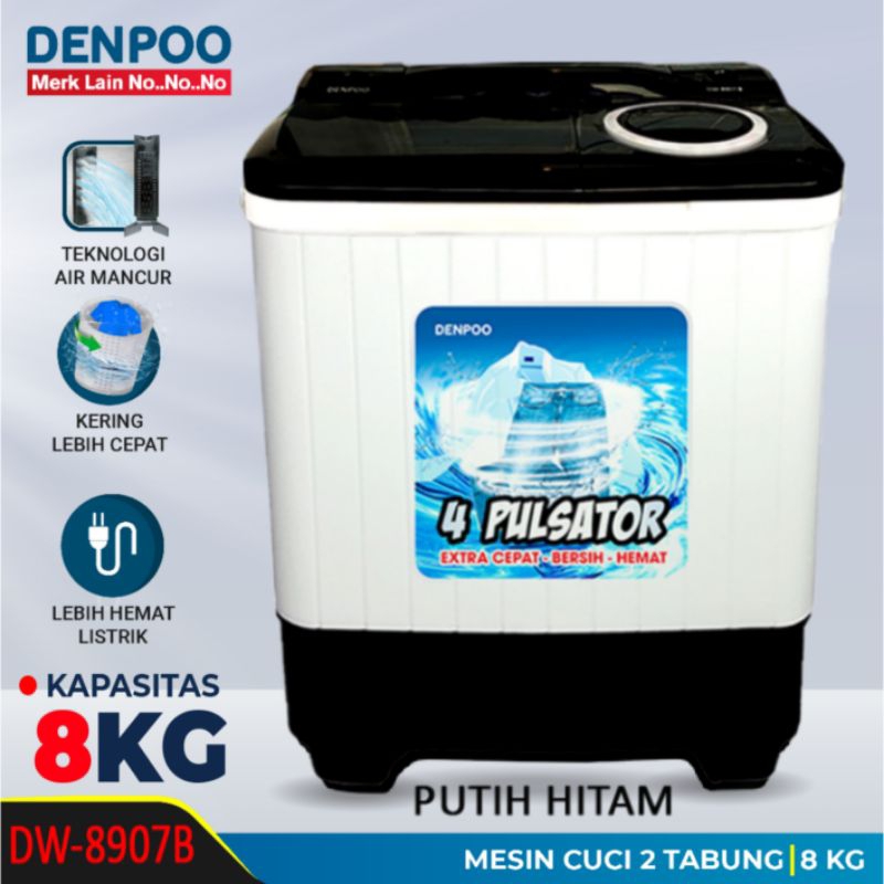 MESIN CUCI DENPOO 2 TABUNG DW 8907 828 KAPASITAS 8 KG TWIN TUBE LOW WATT TURBO PULSATOR 8KG TERBARU MURAH
