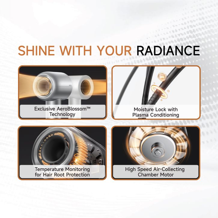 Mova Hair Dryer Shine 10 – Pengering Rambut Profesional Plasma Ion, Cepat Kering, Senyap, Ringan I Teknologi AeroBlossom