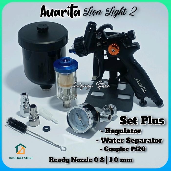 SPRAY GUN AUARITA HVLP MINI LION LIGHT 2 SET PLUS REGULATOR FILTER COUPLER PF 20 NOZZLE 0.8MM DAN 1.0MM - SET PLUS 0.8MM